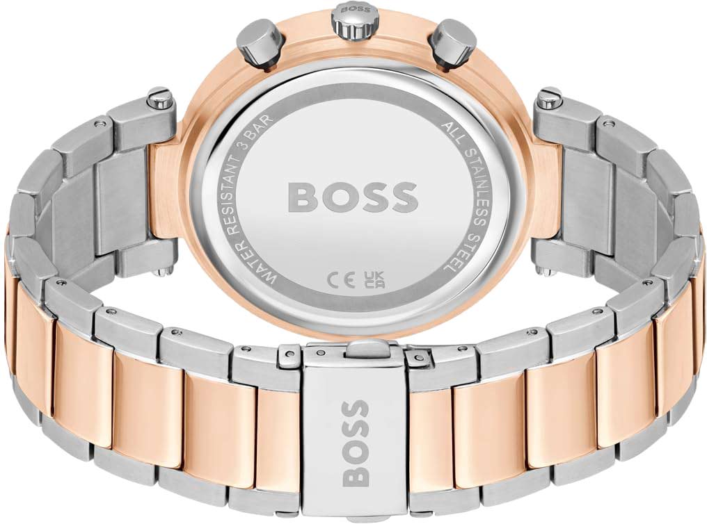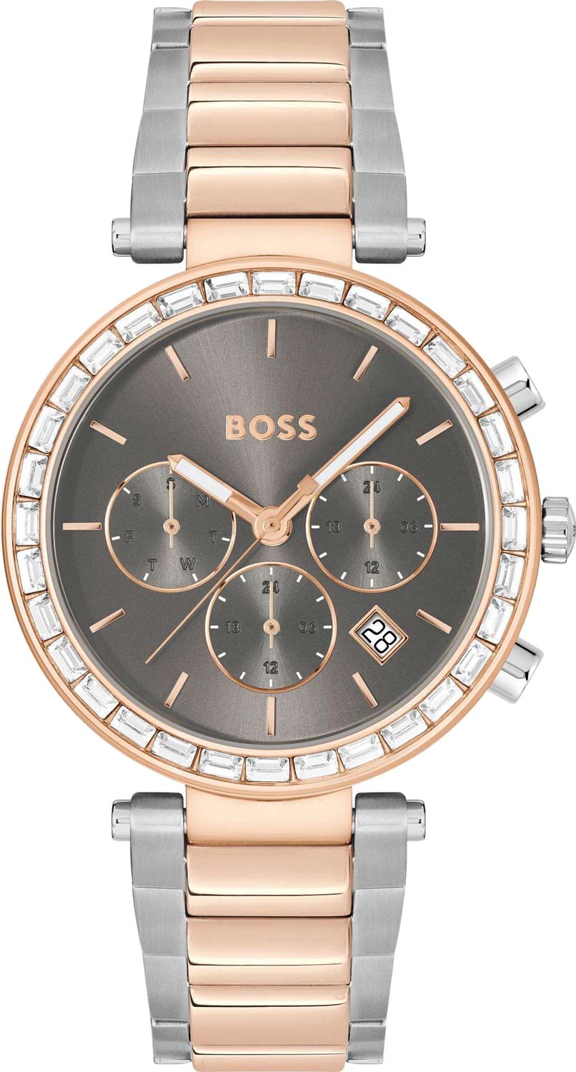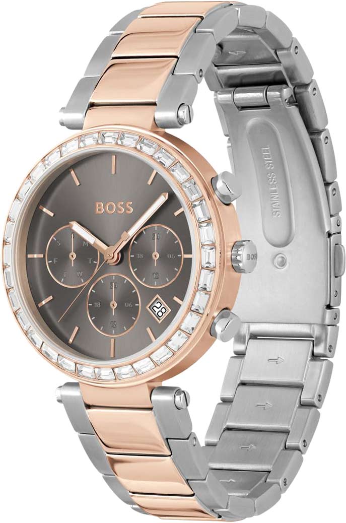 Стильный аксессуар покорит интригующим блеском камней и подчеркнет вашу утонченность. Женские наручные часы. Безель украшен кристаллами. 12-ти и 24-х часовой формат времени. Циферблат выполнен по технологии Sunray (солнечные лучи) и украшен логотипом BOSS. Метки в виде штрихов. Функция дня недели вынесена на отдельный циферблат. Окошко даты находится в положении между отметками 4 и 5 часов. Рифленая заводная головка. Стальной браслет с раскладывающейся застежкой.