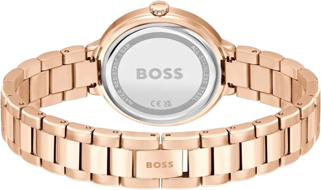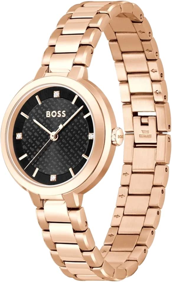Великолепный аксессуар создан для современных девушек, которые не желают потеряться в городской толпе. Женские кварцевые часы. Круглый стальной корпус. Циферблат выполнен по технологии Sunray (солнечные лучи) и украшен фирменным логотипом BOSS. Метки в виде штрихов и точек с кристаллами. Рифленая заводная головка. Удобный стальной браслет.