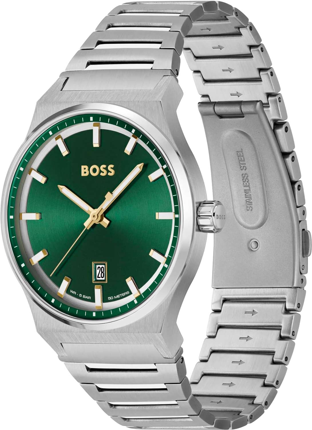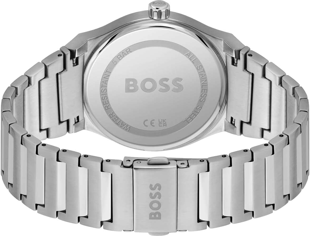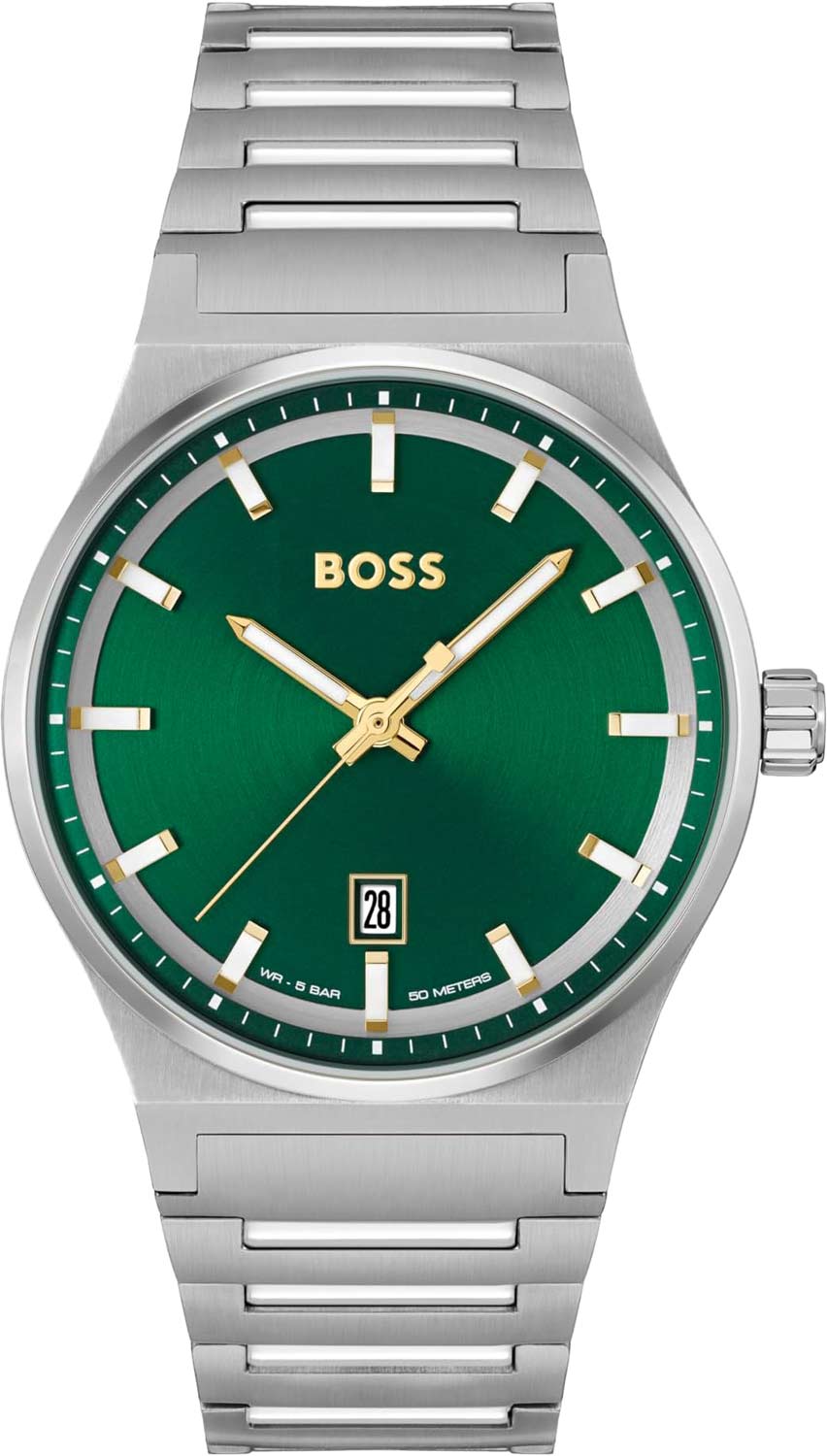 Этот аксессуар станет тем акцентом, который придаст завершенность вашему повседневному образу. Мужские наручные часы. Круглый стальной корпус. Циферблат с метками в виде штрихов выполнен по технологии Sunray (солнечные лучи) и украшен фирменным логотипом BOSS. Окошко даты находится в положении 6 часов. Рифленая заводная головка. Браслет с раскладывающейся застежкой.