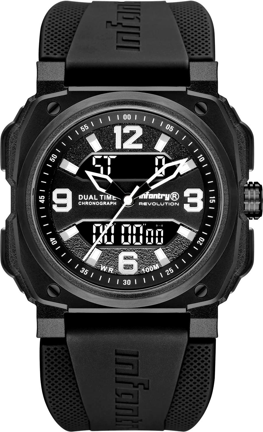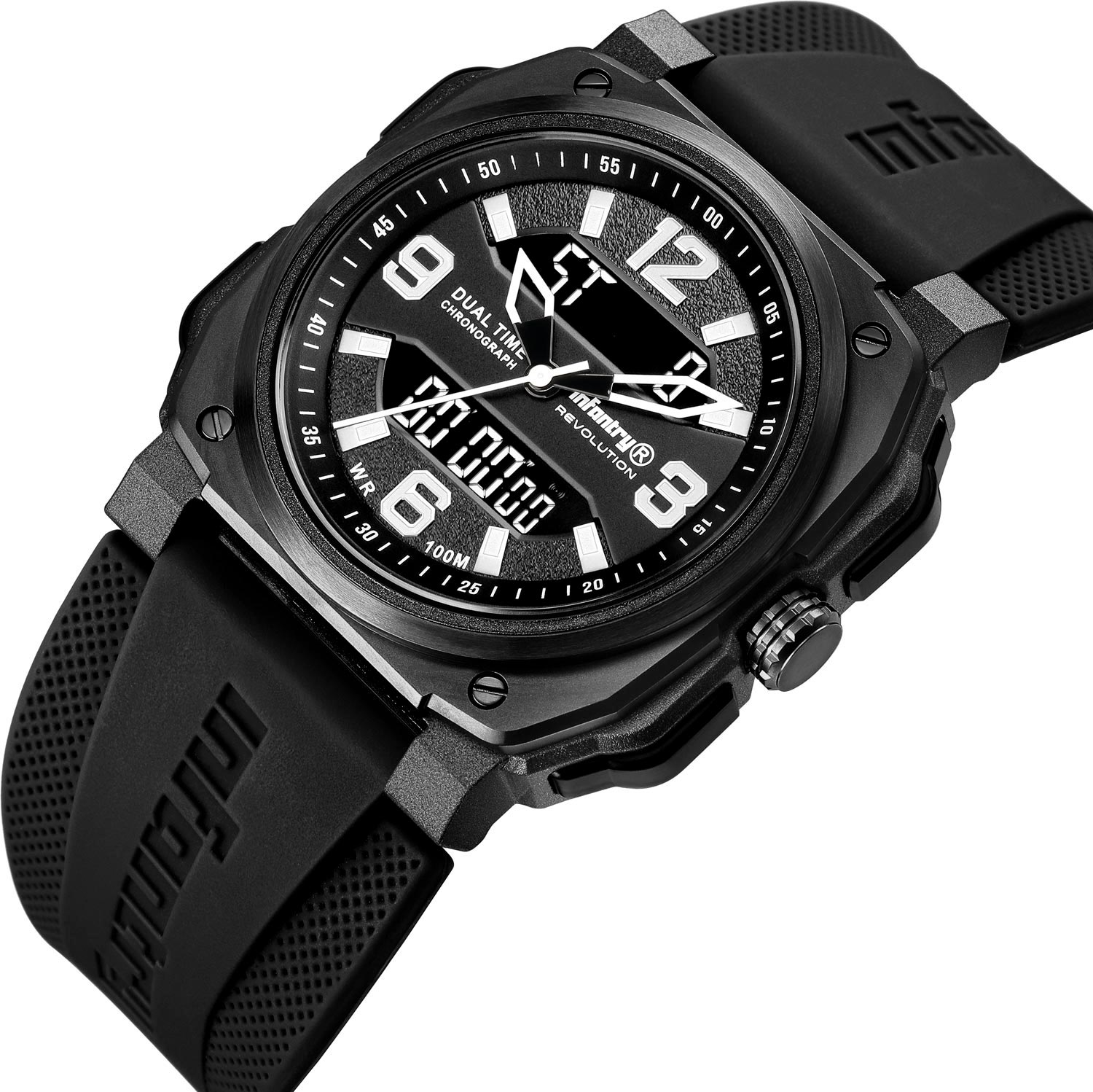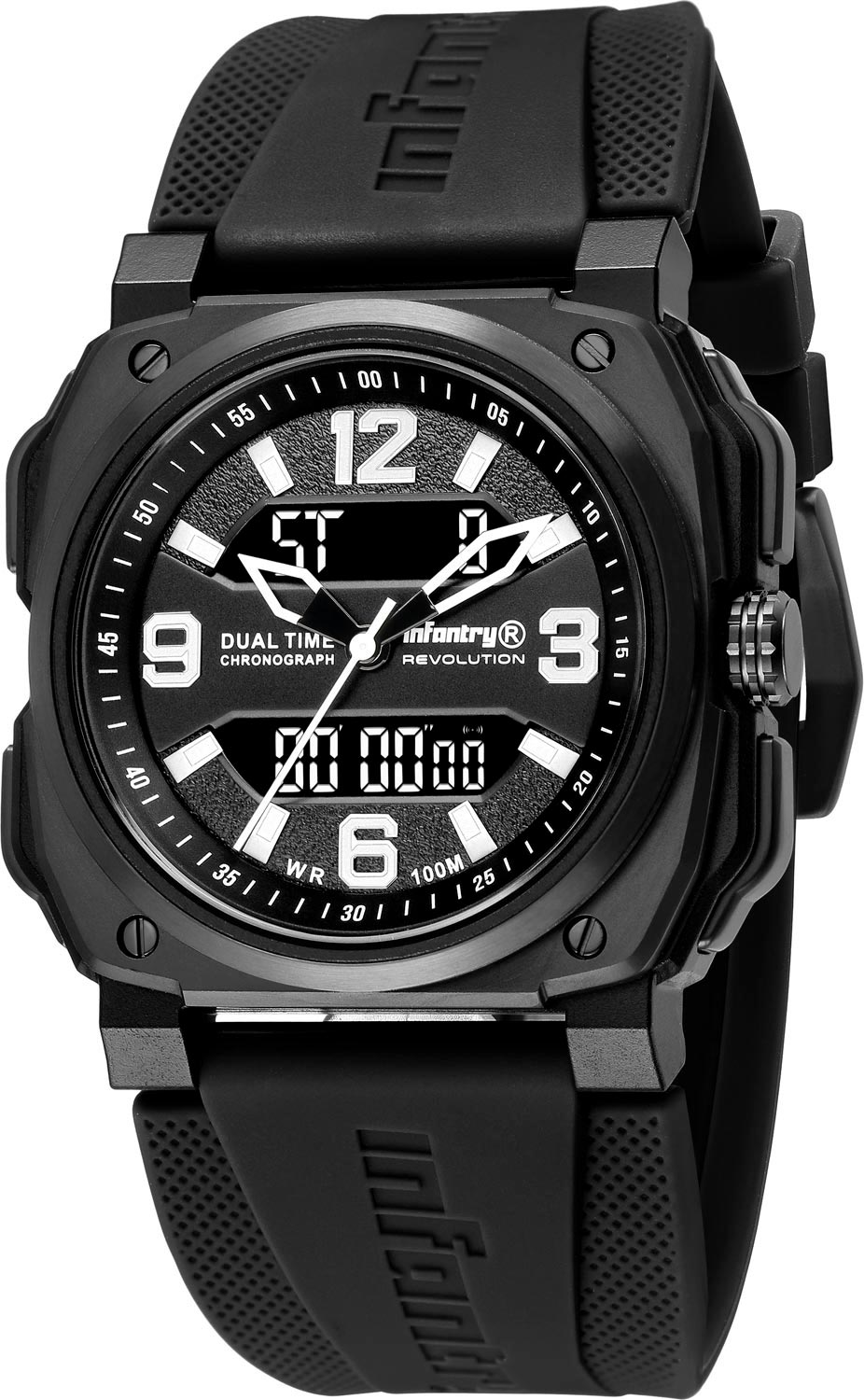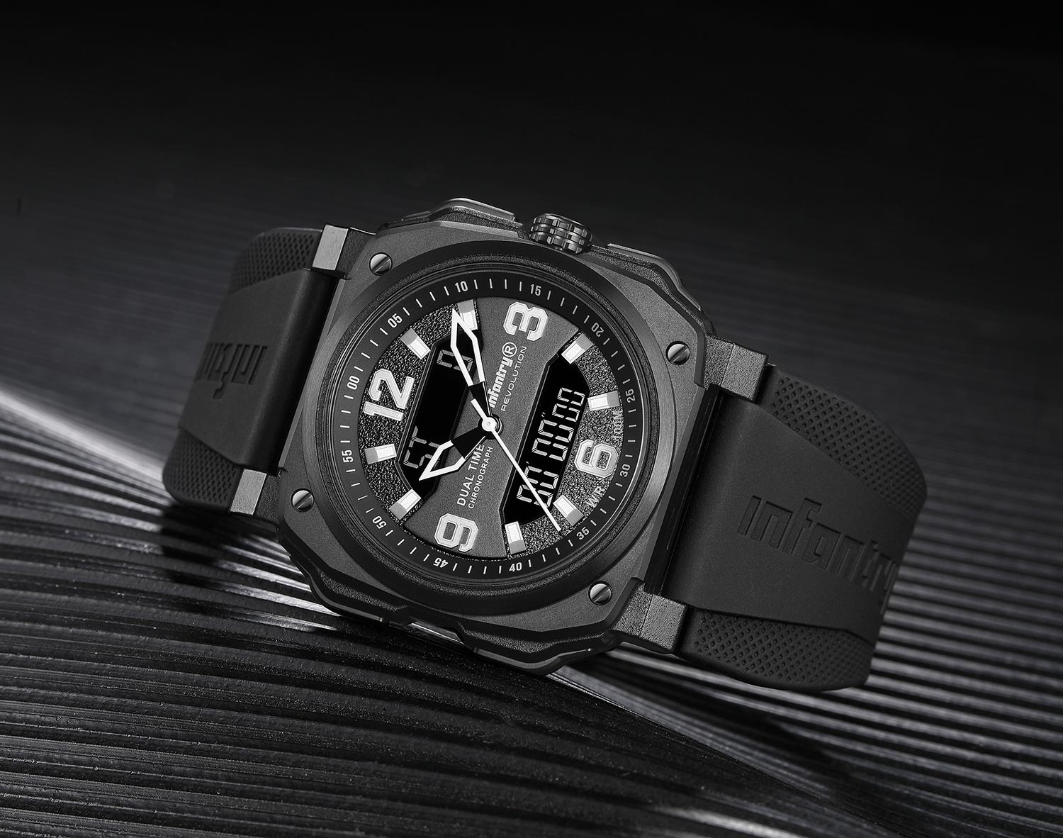 Интригующий и привлекательный стиль этого аксессуара передает ритм современной жизни, помогая покорить драгоценное время. Многофункциональные наручные мужские часы-хронограф с секундомером Dual-timer. Карбоновый квадратный модульный корпус. Второй часовой пояс. Двухуровневый фактурный циферблат с цифровыми дисплеями. Цифровой хронограф. Дата и день недели отображаются на цифровом дисплее. Будильник. Накладные метки в виде арабских цифр и штрихов. Метки и стрелки с люминесцентным покрытием, которое светится в темноте после непродолжительной зарядки на свету. Стальная задняя крышка. Рифленая заводная головка с защитой. Удобный силиконовый ремешок с возможностью быстрой замены. Классическая застежка.