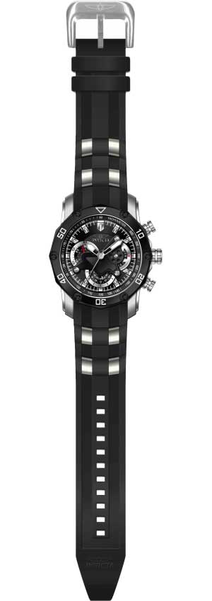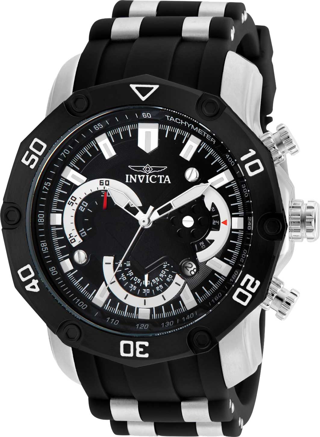Мужские часы-хронограф с секундомером и тахиметром Pro Diver Scuba. Циферблат с метками в виде штрихов. Метки и стрелки с белым люминесцентным покрытием Tritnite, которое светится в темноте после непродолжительной зарядки на свету. Окошко даты находится между часовыми отметками 4 и 5.