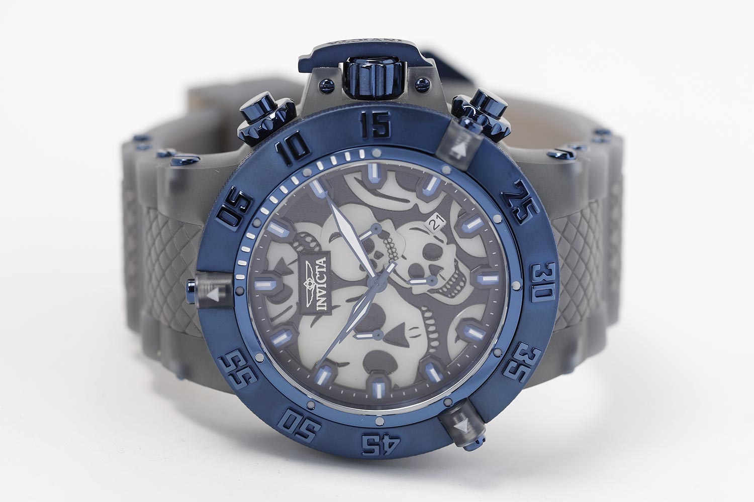 Благодаря высокому уровню инженерной мысли ни один подвиг или событие не будут слишком масштабными для часов Subaqua от Invicta. Огромные размеры этих замечательных часов великолепно воплощены в нержавеющей хирургической стали, швейцарских механизмах и нескольких вариантах ионного покрытия. Часы Invicta Subaqua выдерживают профессиональные погружения под воду, имеют однонаправленный вращающийся безель и встроенную защиту от ударов - Invicta Subaqua - это дайвер, способный выдержать любые приключения на суше и на море. Subaqua Zager Exclusive. Мужские наручные часы-хронограф с секундомером. Круглый прозрачный корпус c матовой поверхностью. Стальной вращающийся безель с минутной шкалой украшен прозрачными пластиковыми вставками со стильными винтами. Циферблат украшен рельефным изображением черепов. Мечевидные стрелки в стиле Sword. Метки в виде штрихов. Метки и стрелки с белым люминесцентным покрытием New Lite, которое светится в темноте после непродолжительной зарядки на свету. Окошко даты находится между часовыми отметками 4 и 5. Рифленая заводная головка с системой блокировки. Завинчивающаяся задняя крышка. Удобный прозрачный силиконовый ремешок с классической застежкой украшен стальными и пластиковыми вставками. Производитель оставляет за собой право вносить изменения во внешний вид часов. Уточняйте при заказе, какой вариант в наличии в данный момент.