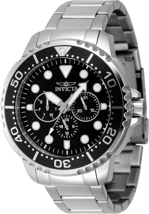 Мужские часы Pro Diver. 12-ти и 24-х часовой формат времени, дата и день недели вынесены на отдельные циферблаты. Циферблат с метками в виде точек. Метки и стрелки с белым люминесцентным покрытием New Lite, которое светится в темноте после непродолжительной зарядки на свету.