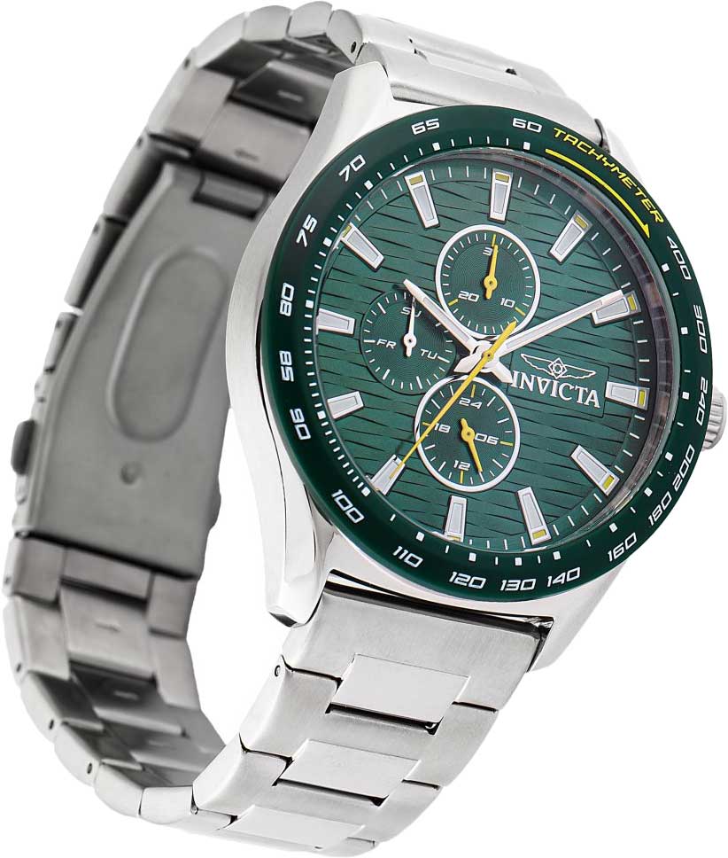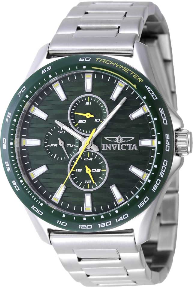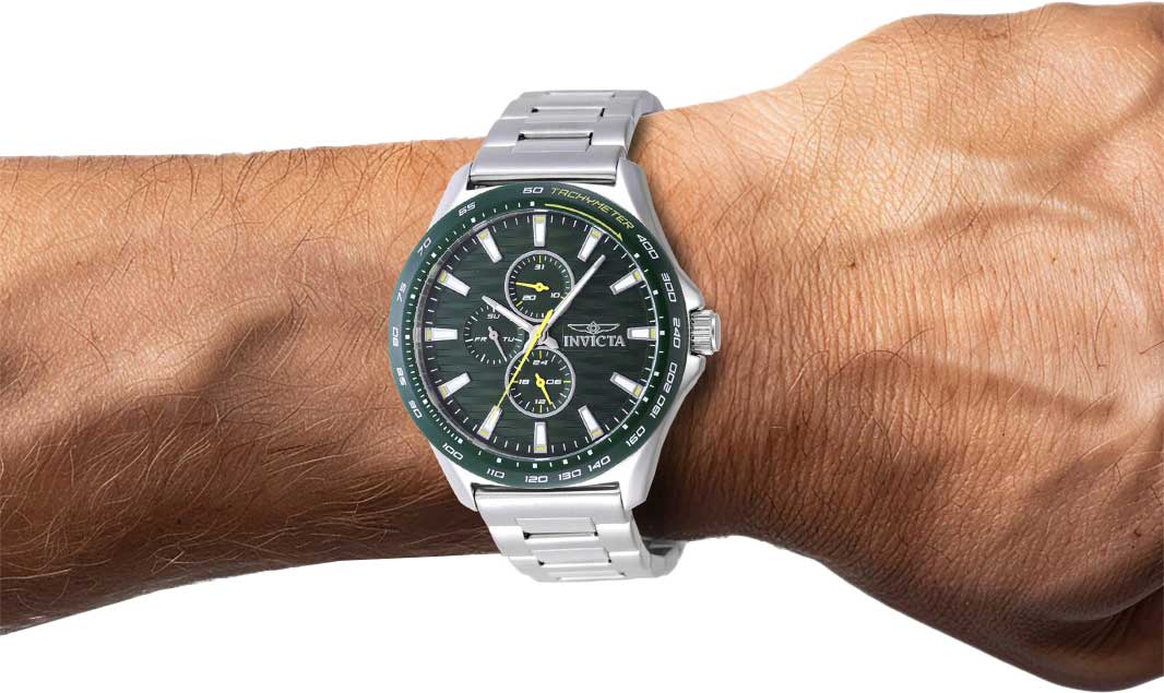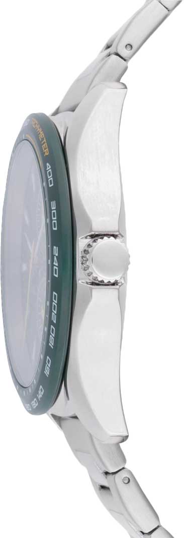 Мужские часы с тахиметром Racing. 12-ти и 24-х часовой формат времени, дата и день недели вынесены на отдельные циферблаты. Текстурный циферблат с метками в виде штрихов.
