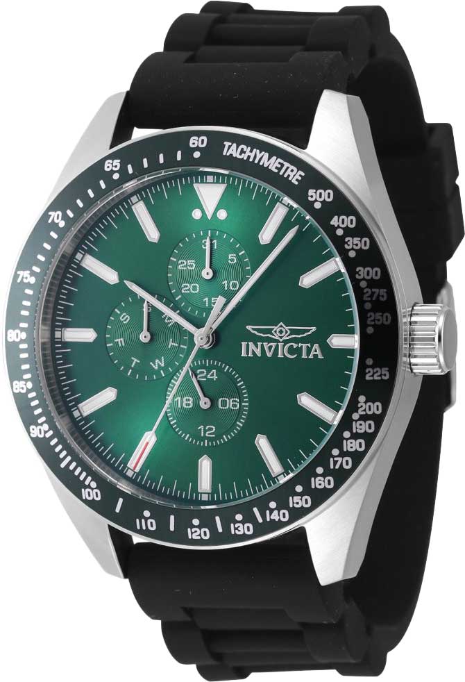 Мужские часы с тахиметром Aviator. 12-ти и 24-х часовой формат времени, дата и день недели вынесены на отдельные циферблаты. Циферблат с метками в виде штрихов выполнен по технологии Sunray (солнечные лучи).