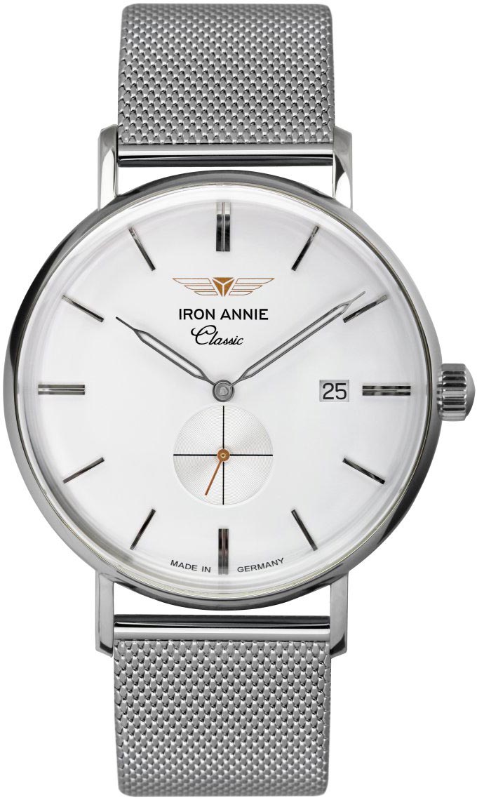 Качественный аксессуар с утонченным и самобытным дизайном будет отлично смотреться как в повседневной жизни, так и на серьезном мероприятии со строгим костюмом. Iron Annie Classic. В механизме 5 камней. Секундная стрелка вынесена на отдельный циферблат. Окошко даты. Браслет миланского плетения.