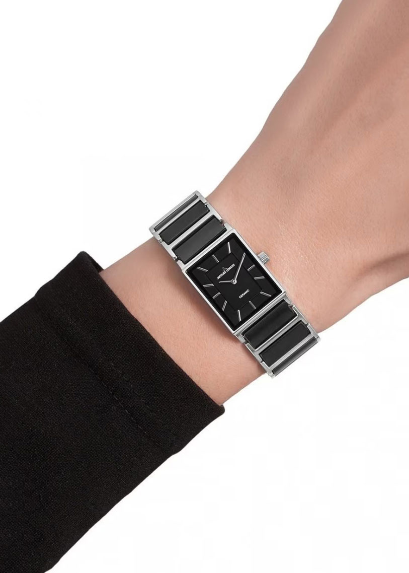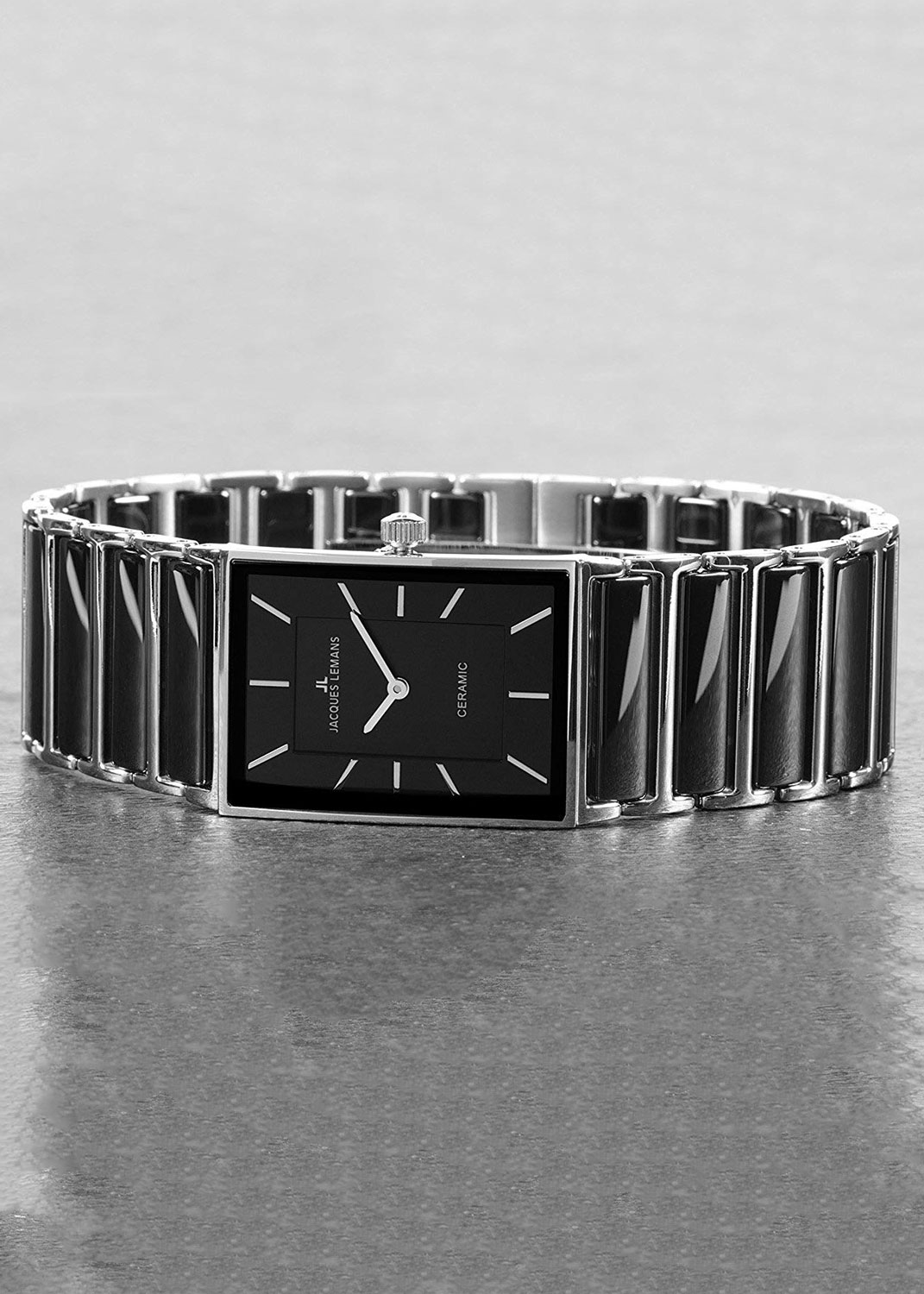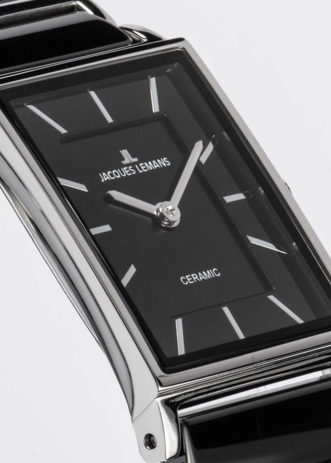 Женские наручные часы York. Прямоугольный стальной корпус. Циферблат с метками в виде штрихов. Рифленая заводная головка. Стальной браслет с керамическими вставками. Раскладывающаяся застежка.