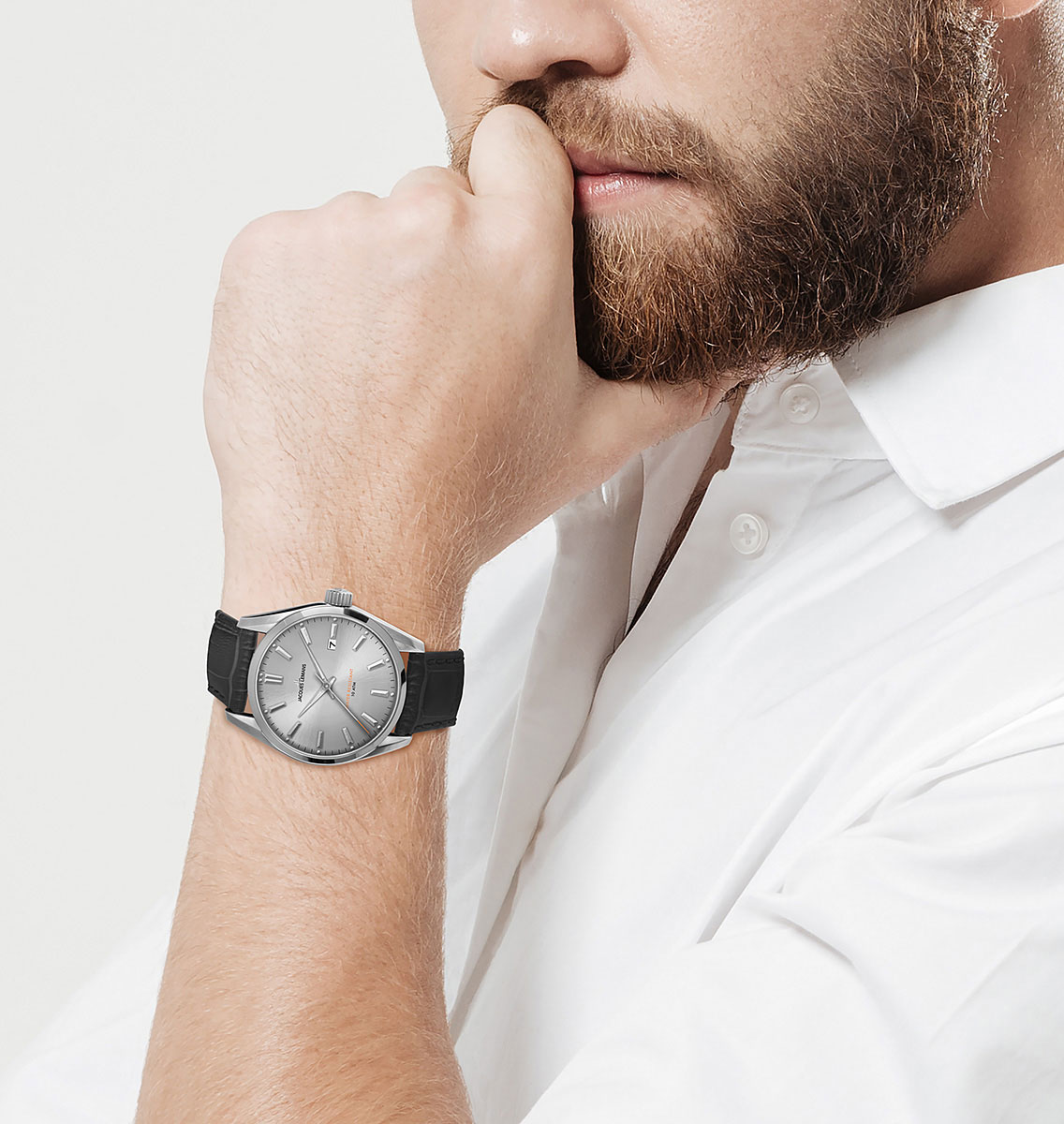 Классические черты и стильный дизайн этих часов станут залогом успешного мужчины. Derby. Циферблат выполнен по технологии Sunray (солнечные лучи). Метки в виде штрихов. Окошко даты. Рифленая заводная головка. Круглый корпус. Ремешок из натуральной кожи с тиснением под кожу крокодила. Классическая застежка.