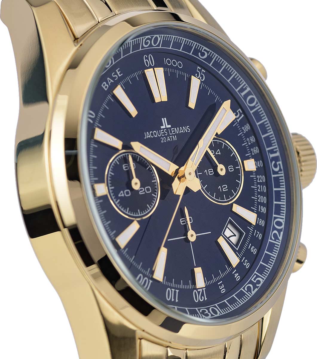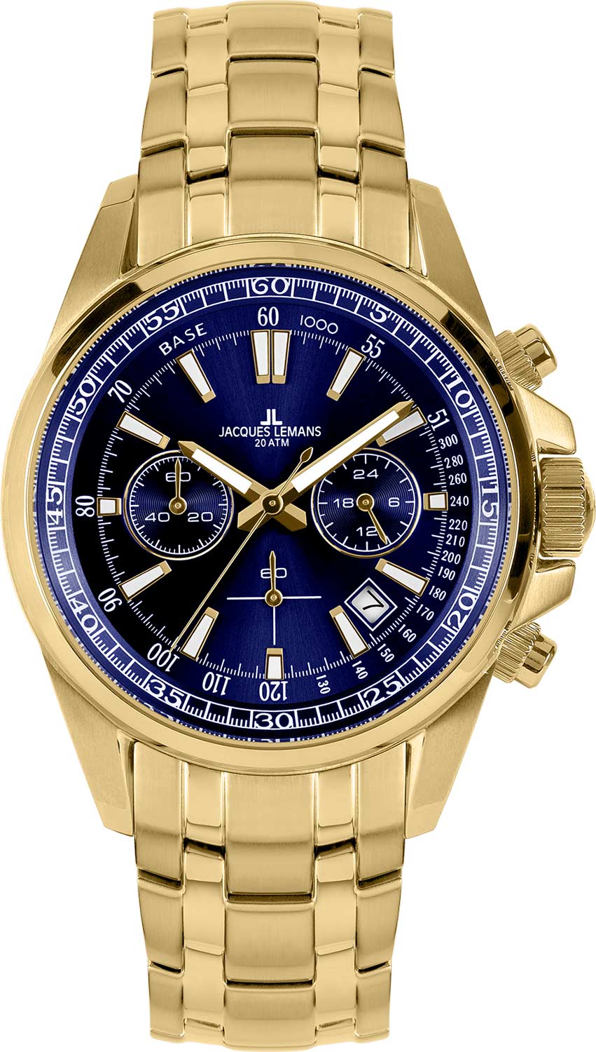 Функциональные часы - незаменимый аксессуар в жизни активного молодого человека. Liverpool. Часы-хронограф с секундомером и тахиметром. 12-ти и 24-х часовой формат времени. Циферблат выполнен по технологии Sunray (солнечные лучи). Метки в виде штрихов. Окошко даты находится между отметками 4 и 5 часов. Рифленая заводная головка с защитой украшена фирменным логотипом Jacques Lemans. Браслет с раскладывающейся застежкой. Застежка с системой блокировки.