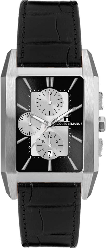 Надежный функциональный аксессуар с безупречным дизайном - незаменимый деталь образа успешного мужчины. Часы-хронограф с секундомером. Прямоугольный стальной корпус. Циферблат выполнен по технологии Sunray (солнечные лучи) и украшен фирменным логотипом Jacques Lemans. Метки в виде штрихов. Окошко даты находится в положении 6 часов. Стрелки с люминесцентным покрытием, которое светится в темноте после непродолжительной зарядки на свету. Граненая заводная головка. Кожаный ремешок с классической застежкой.