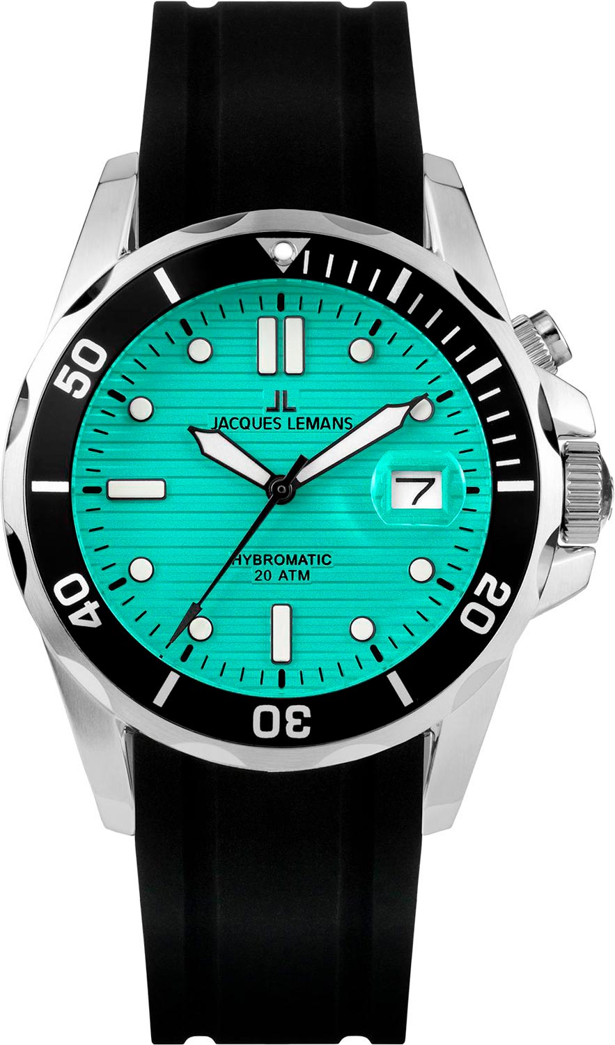 Практичный дизайн, надежность, высокие технологии - эти часы созданы специально для сильных мужчин, которые ищут приключения и не могут жить без адреналина и новых ощущений. Мужские наручные часы. Часы с уникальной технологией Jacques Lemans Hybromatic, которая сочетает в себе функциональность автоматических часов с точностью кварцевых часов. Движение руки приводит в движение маховик, генерирующий электрическую энергию, которая используется для запуска часов. Запас хода 4320 часов (180 дней). Аккумуляторные батареи рассчитаны на 12-15 лет. Круглый стальной корпус. Вращающийся безель с минутной шкалой. Структурный циферблат с накладными метками в виде точек и штрихов. Окошко даты с увеличительным стеклом в положении 3 часа. Стрелки и метки с люминесцентным покрытием, которое светится в темноте после непродолжительной зарядки на свету. Ударопрочное минеральное стекло Crystex. Рифленая заводная головка с защитой. Силиконовый ремешок с классической застежкой.