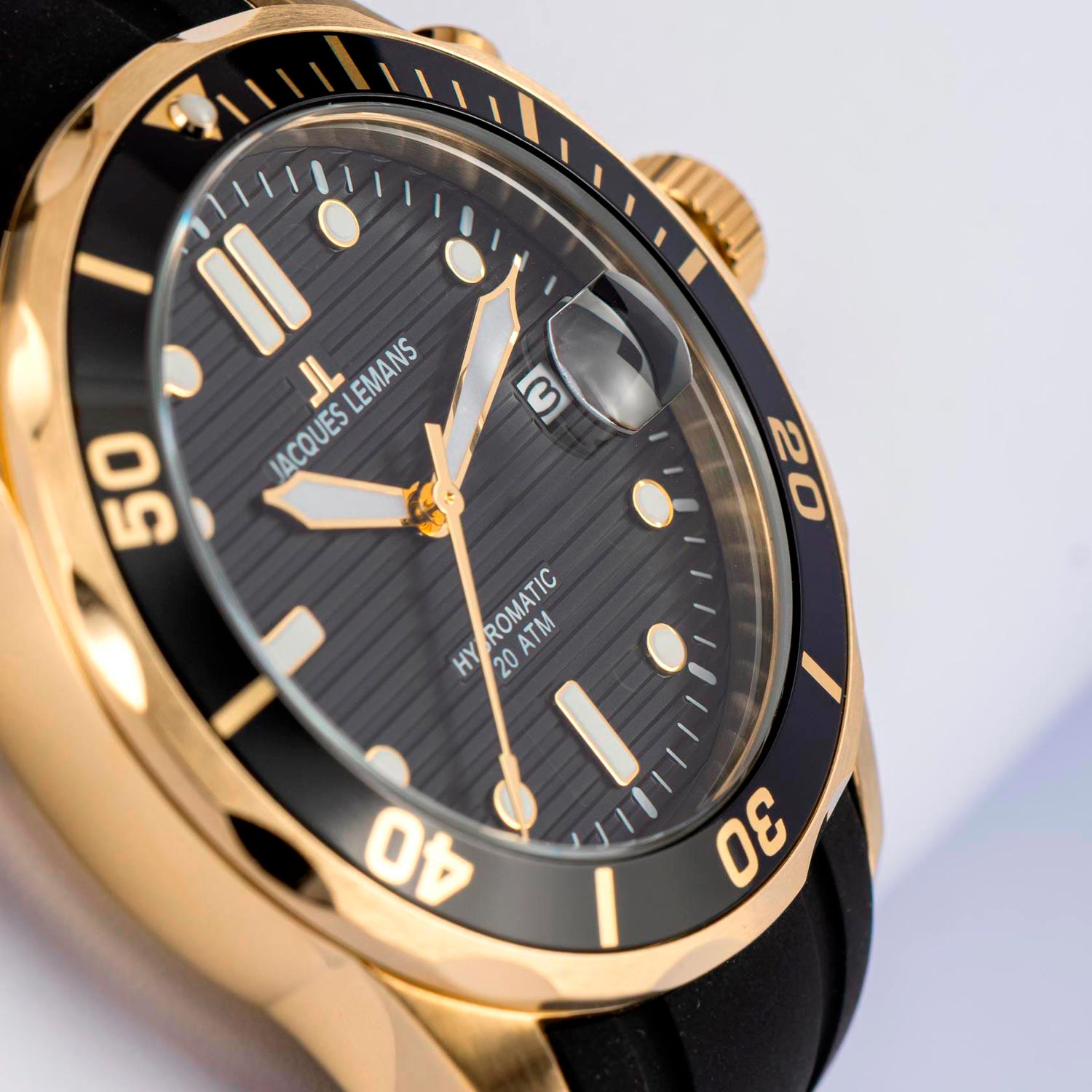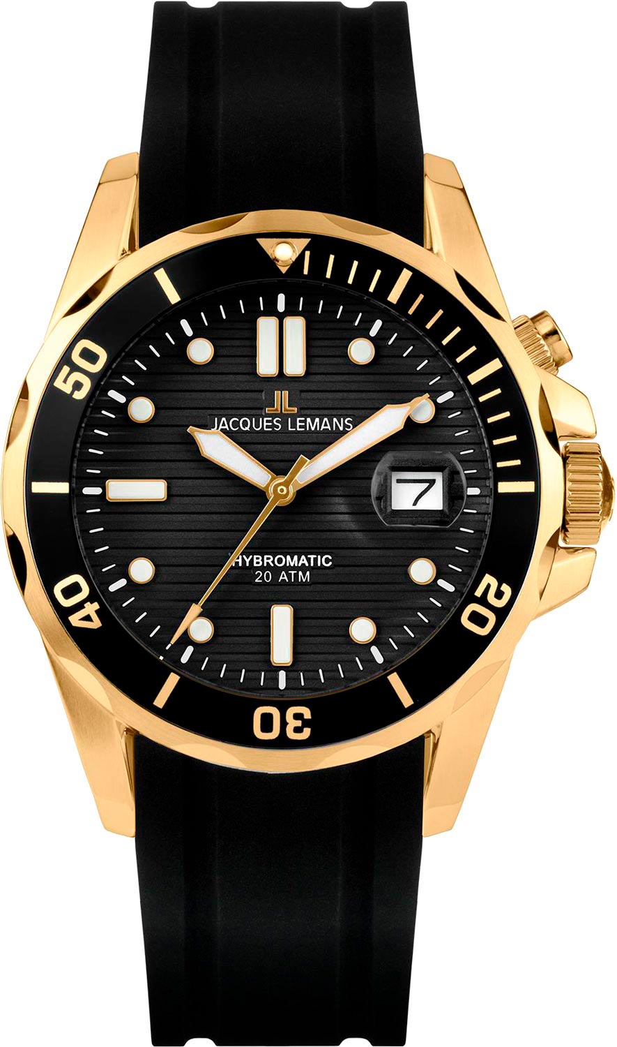 Практичный дизайн, надежность, высокие технологии - эти часы созданы специально для сильных мужчин, которые ищут приключения и не могут жить без адреналина и новых ощущений. Мужские наручные часы. Часы с уникальной технологией Jacques Lemans Hybromatic, которая сочетает в себе функциональность автоматических часов с точностью кварцевых часов. Движение руки приводит в движение маховик, генерирующий электрическую энергию, которая используется для запуска часов. Запас хода 4320 часов (180 дней). Аккумуляторные батареи рассчитаны на 12-15 лет. Круглый стальной корпус. Вращающийся безель с минутной шкалой. Структурный циферблат с накладными метками в виде точек и штрихов. Окошко даты с увеличительным стеклом в положении 3 часа. Стрелки и метки с люминесцентным покрытием, которое светится в темноте после непродолжительной зарядки на свету. Ударопрочное минеральное стекло Crystex. Рифленая заводная головка с защитой. Силиконовый ремешок с классической застежкой.