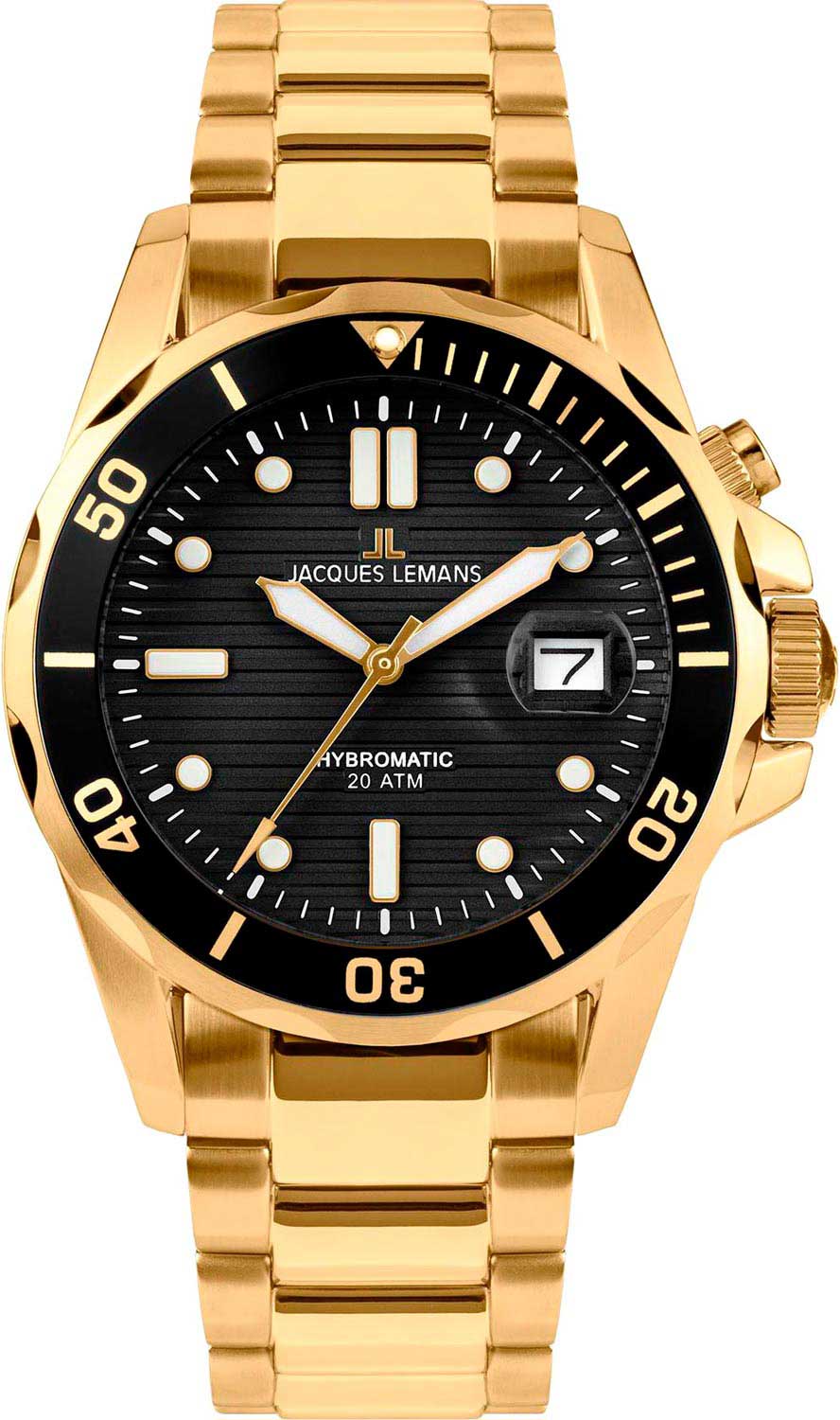 Мужские наручные часы. Часы с уникальной технологией Jacques Lemans Hybromatic, которая сочетает в себе функциональность автоматических часов с точностью кварцевых часов. Движение руки приводит в движение маховик, генерирующий электрическую энергию, которая используется для запуска часов. Запас хода 4320 часов (180 дней). Аккумуляторные батареи рассчитаны на 12-15 лет. Круглый стальной корпус. Вращающийся безель с минутной шкалой. Структурный циферблат с накладными метками в виде точек и штрихов. Окошко даты с увеличительным стеклом в положении 3 часа. Стрелки и метки с люминесцентным покрытием, которое светится в темноте после непродолжительной зарядки на свету. Ударопрочное минеральное стекло Crystex. Рифленая заводная головка с защитой. Стальной браслет с раскладывающейся застежкой.