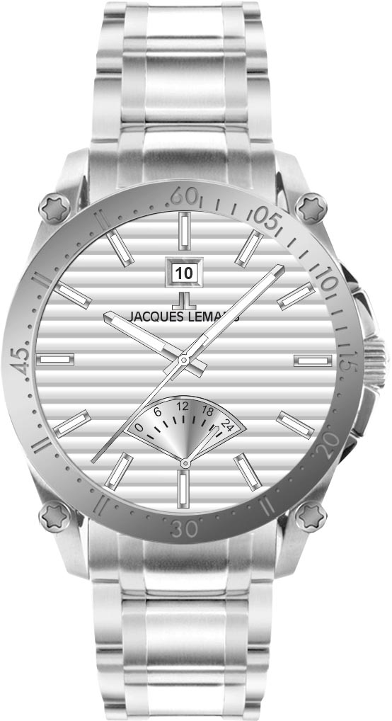 Наручные мужские часы Derby с круглым стальным корпусом. На ушках закреплены декоративные винты. Широкий безель с секундной шкалой. Ретроградный указатель второго часового пояса в 24-х часовом формате времени. Окошко даты находится в положении 12 часов. Циферблат с узором в виде горизонтальных полос украшен фирменным логотипом Jacques Lemans. Накладные метки в виде штрихов.