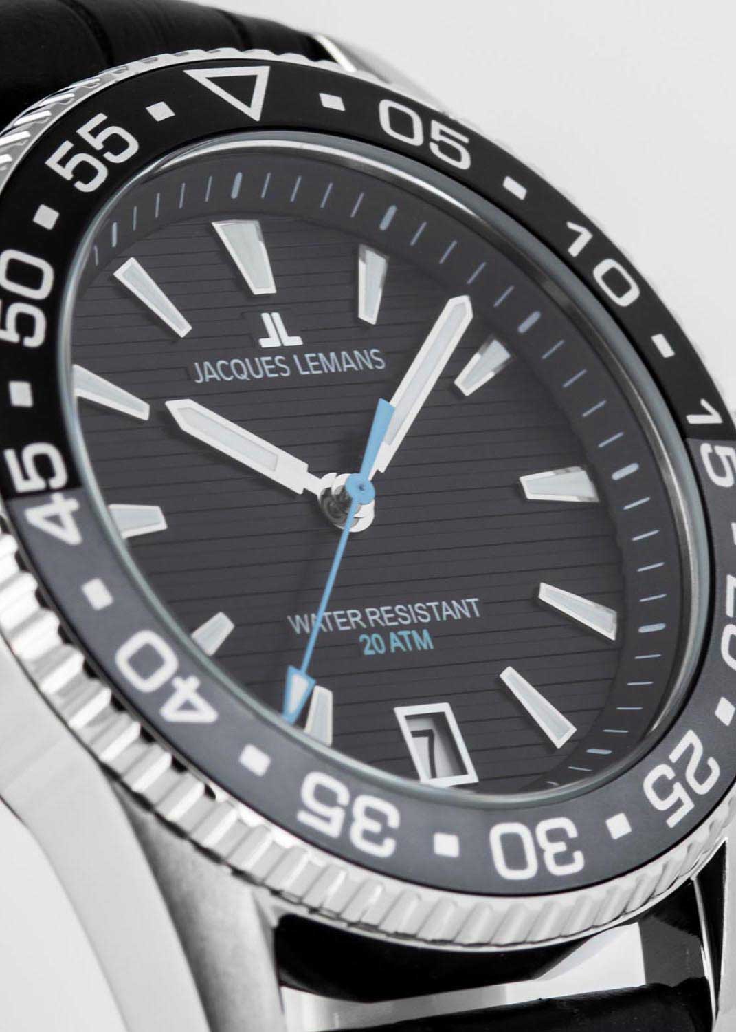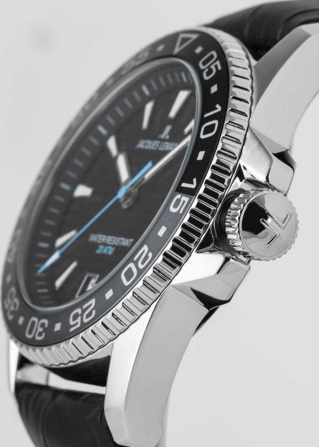 Мужские наручные часы Liverpool Diver. Круглый стальной корпус с матовой и полированной отделкой. Широкий безель с секундной шкалой. Циферблат с узором в виде горизонтальных полос, которые делают его визуально более широким. Циферблат украшен фирменным логотипом Jacques Lemans. Накладные метки в виде штрихов. Широкие заостренные прямоугольные стрелки в стиле Baton.