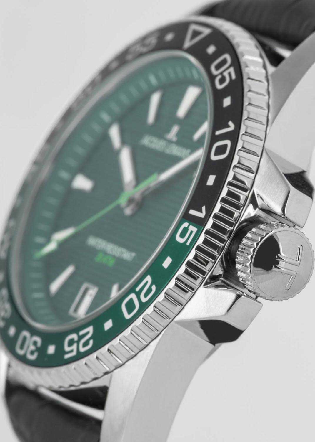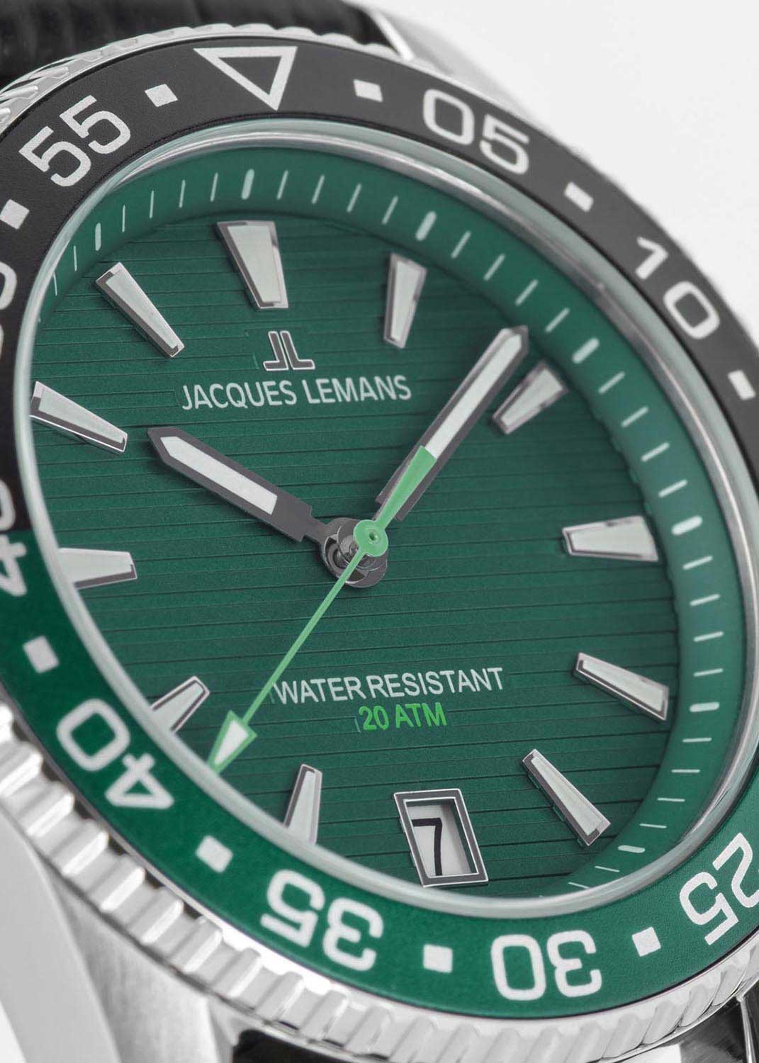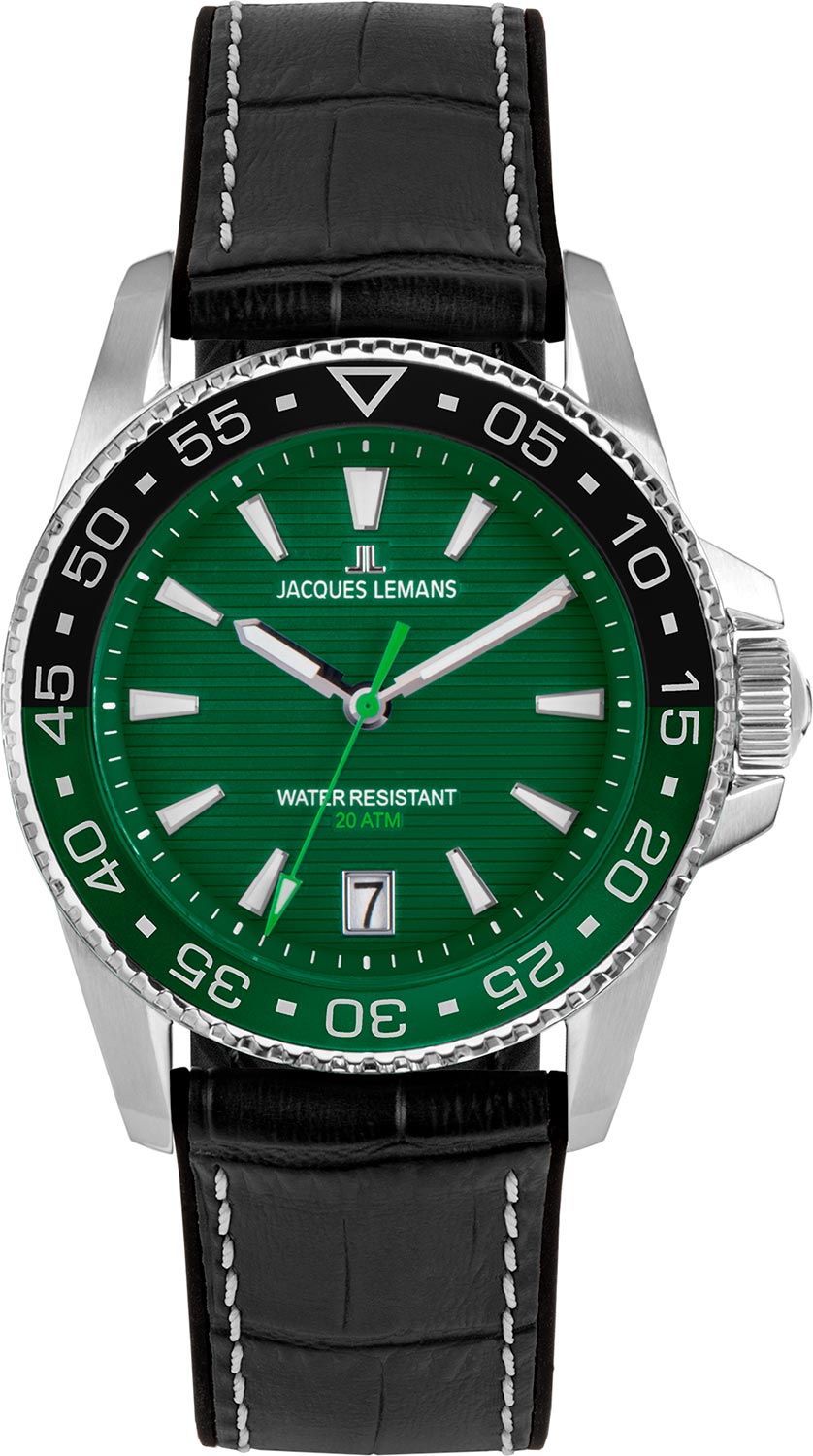 Мужские наручные часы Liverpool Diver. Круглый стальной корпус с матовой и полированной отделкой. Широкий безель с секундной шкалой. Циферблат с узором в виде горизонтальных полос, которые делают его визуально более широким. Циферблат украшен фирменным логотипом Jacques Lemans. Накладные метки в виде штрихов. Широкие заостренные прямоугольные стрелки в стиле Baton.