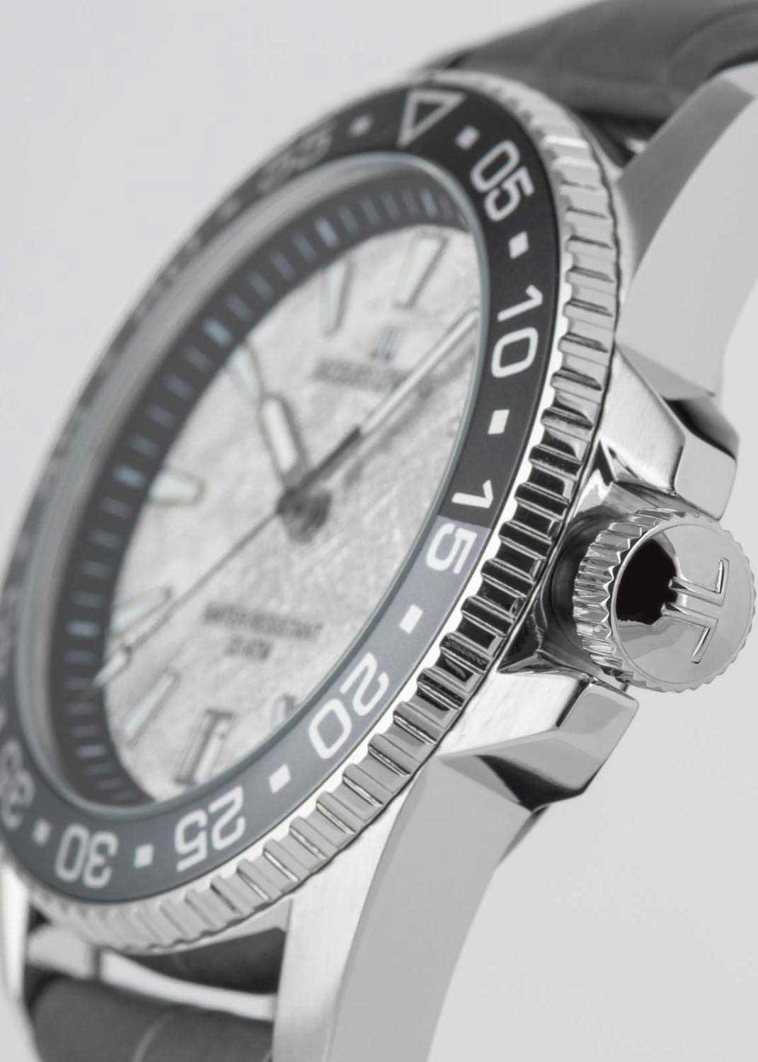 Метки и стрелки с люминесцентным покрытием, которое светится в темноте после непродолжительной зарядки на свету. Окошко даты, выделенное полированной рамкой, находится в положении 6 часов. Рифленая заводная головка с защитой. Ремешок состоит из двух частей: внутренняя сделана из силикона, внешняя — из натуральной кожи. Классическая застежка с логотипом бренда.