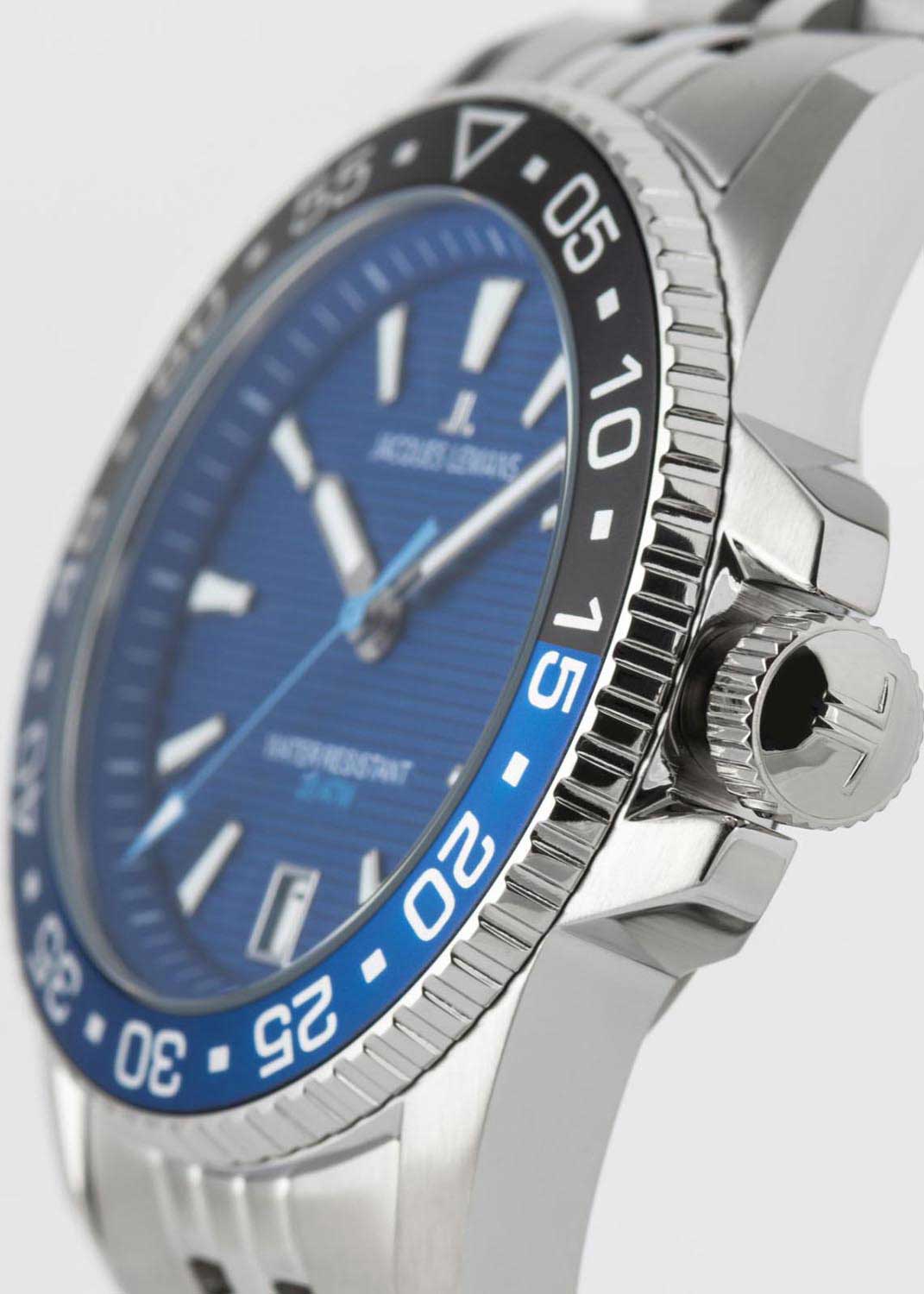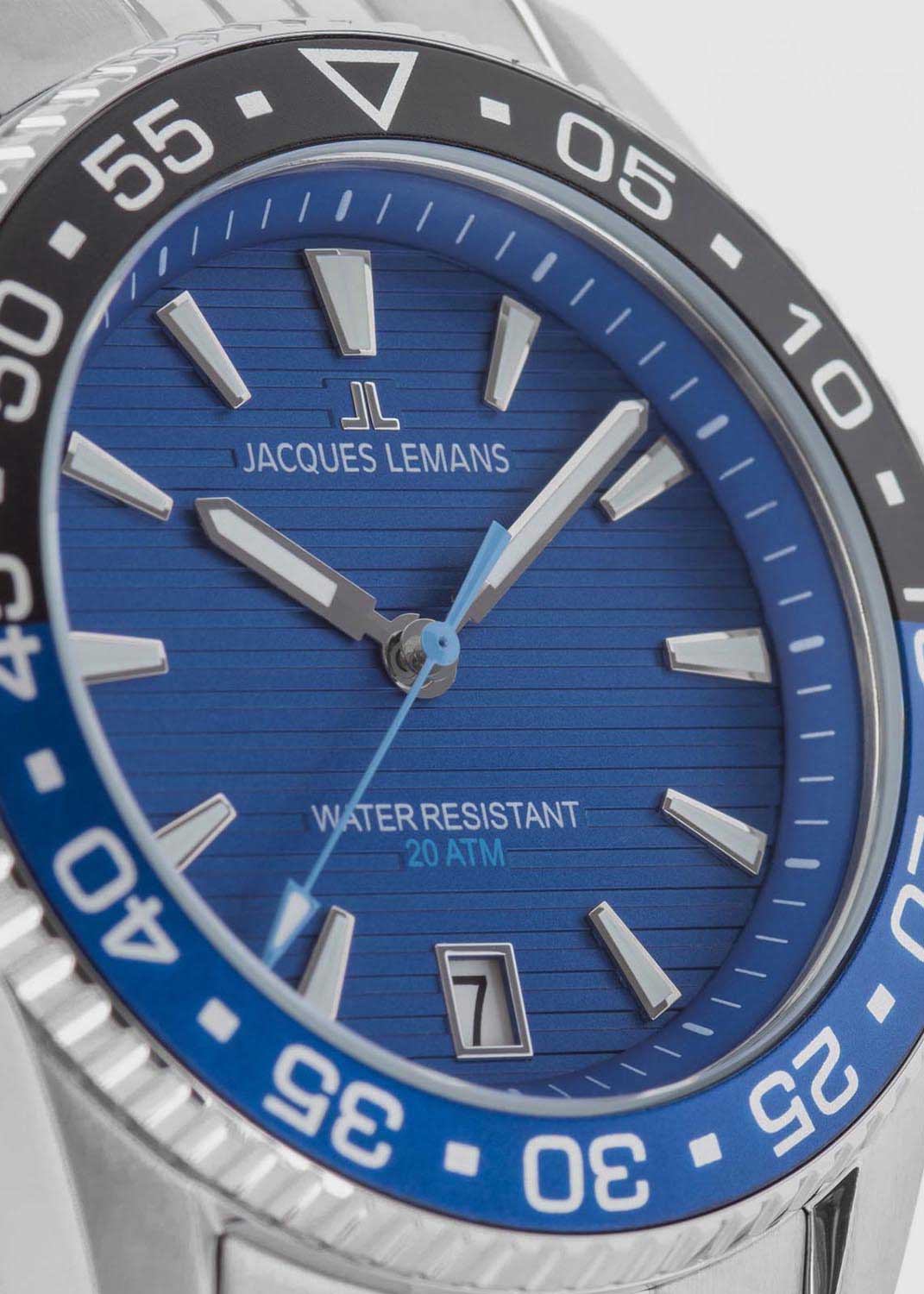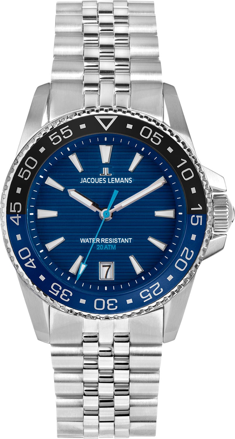 Мужские наручные часы Liverpool Diver. Круглый стальной корпус с матовой и полированной отделкой. Широкий безель с секундной шкалой. Циферблат с узором в виде горизонтальных полос, которые делают его визуально более широким. Циферблат украшен фирменным логотипом Jacques Lemans. Накладные метки в виде штрихов. Широкие заостренные прямоугольные стрелки в стиле Baton.