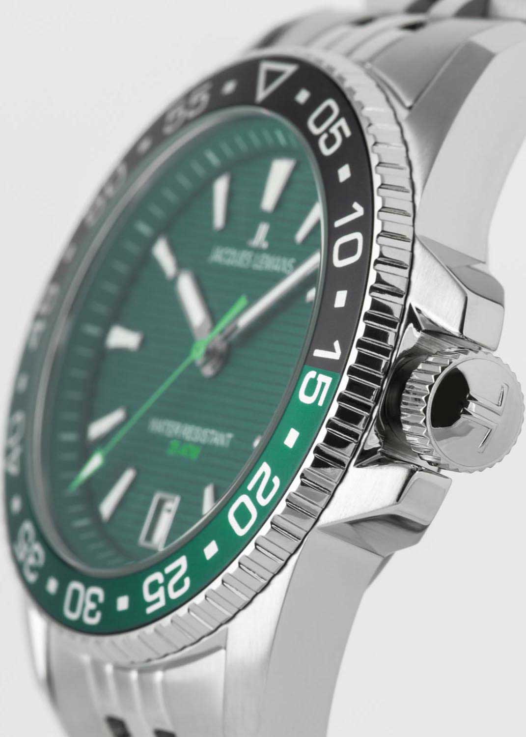 Мужские наручные часы Liverpool Diver. Круглый стальной корпус с матовой и полированной отделкой. Широкий безель с секундной шкалой. Циферблат с узором в виде горизонтальных полос, которые делают его визуально более широким. Циферблат украшен фирменным логотипом Jacques Lemans. Накладные метки в виде штрихов. Широкие заостренные прямоугольные стрелки в стиле Baton.