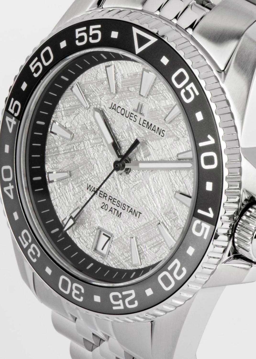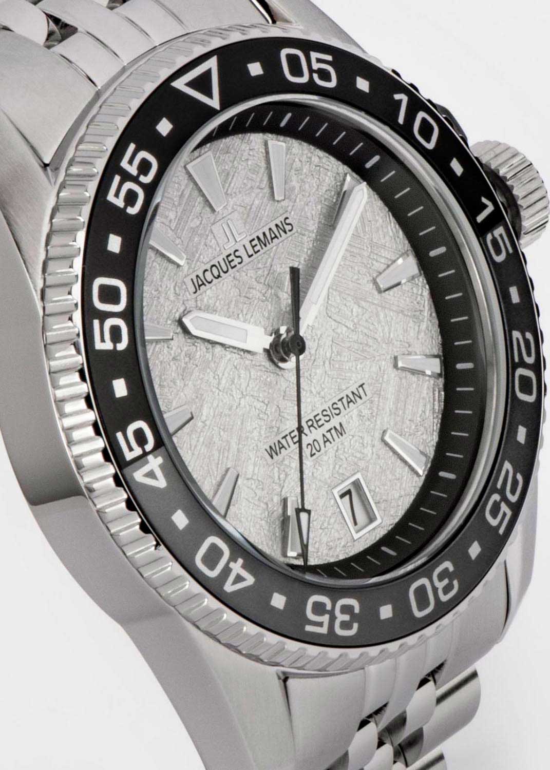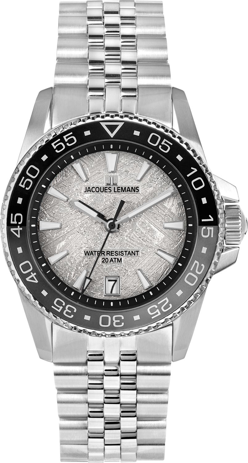 Мужские наручные часы Liverpool Diver. Круглый стальной корпус с матовой и полированной отделкой. Широкий безель с секундной шкалой. Циферблат с интересной текстурой, которая делает его визуально более широким. Циферблат украшен фирменным логотипом Jacques Lemans. Накладные метки в виде штрихов. Широкие заостренные прямоугольные стрелки в стиле Baton.
