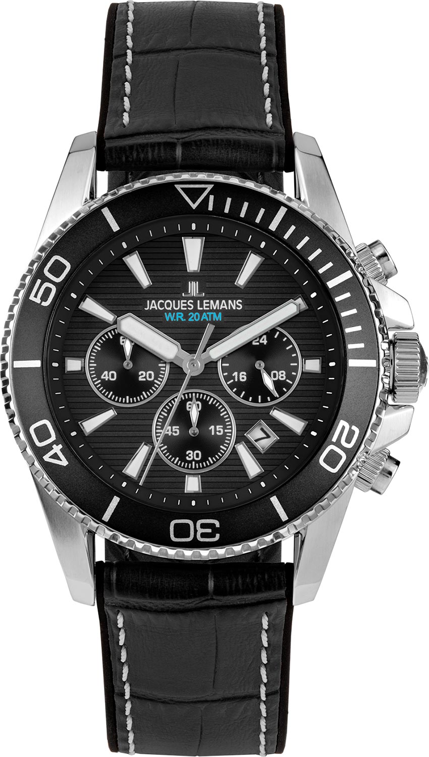 Функциональные мужские наручные часы-хронограф с секундомером Liverpool Diver. Круглый стальной корпус с матовой и полированной отделкой. Широкий безель с секундной шкалой. Циферблат с узором в виде горизонтальных полос, которые делают его визуально более широким. Циферблат украшен фирменным логотипом Jacques Lemans. Накладные метки в виде штрихов. Широкие заостренные прямоугольные стрелки в стиле Baton.