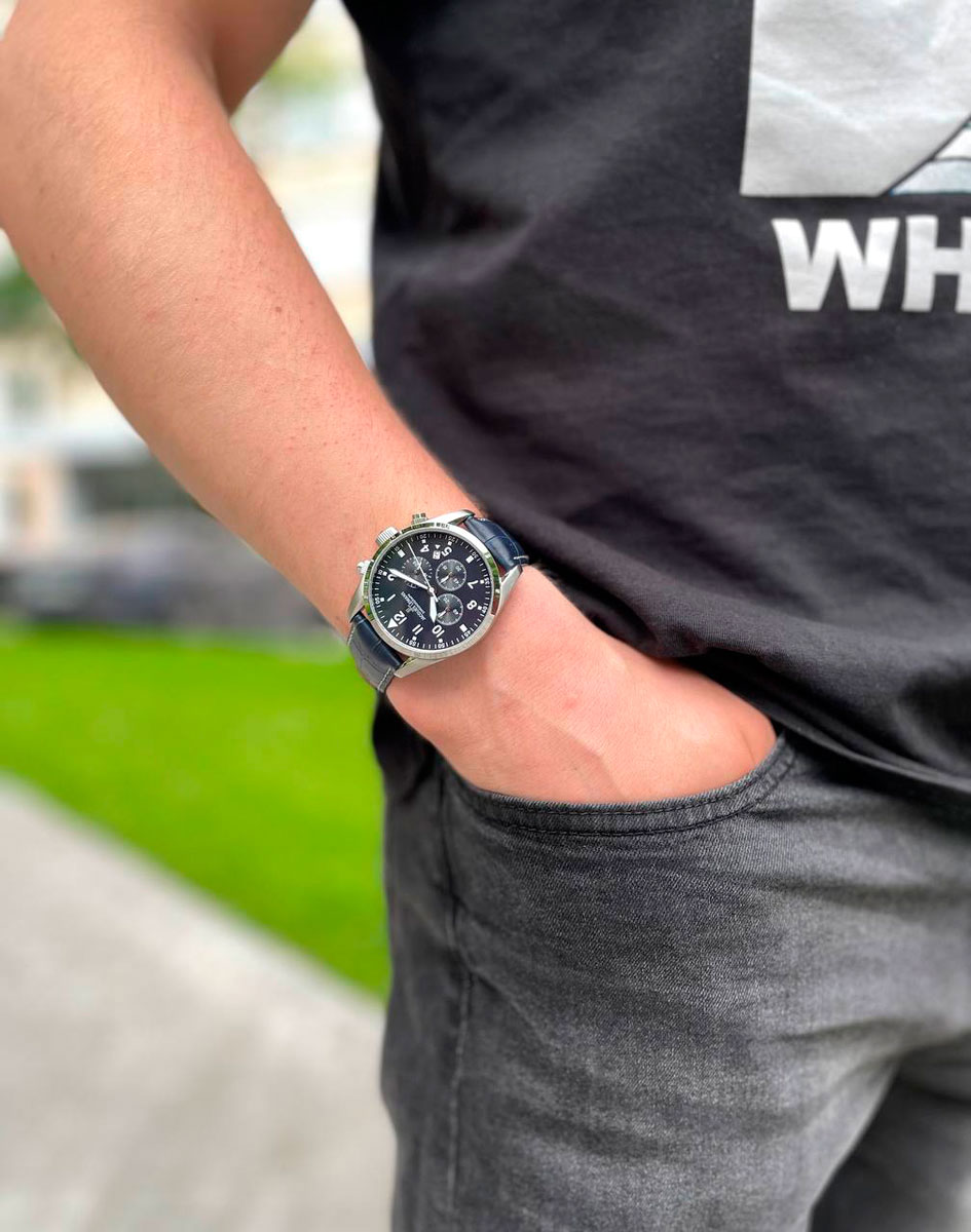 Практичный хронограф, выполненный в классическом дизайне - великолепный выбор для ценителей динамичного образа жизни. Sport. Кварцевые наручные часы-хронограф с секундомером. Круглый стальной корпус с полированными и сатинированными поверхностями. Мечевидные стрелки в стиле Sword. Метки в виде арабских цифр, 3, 6 и 9 часовые метки в виде штрихов. Метки и стрелки с люминесцентным покрытием, которое светится в темноте после непродолжительной зарядки на свету. 12-ти и 24-х часовой формат времени отображаются на отдельных циферблатах. Окошко даты находится между часовыми отметками 4 и 5. Рифленая заводная головка. Текстурированный кожаный ремешок с классической застежкой.