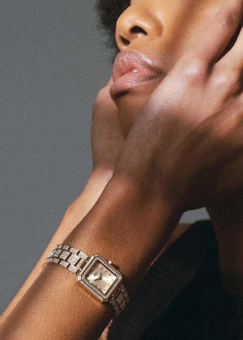 - Камень-вставкациферблат украшен 12 искусственными бриллиантами, корпус и браслет — кристаллами