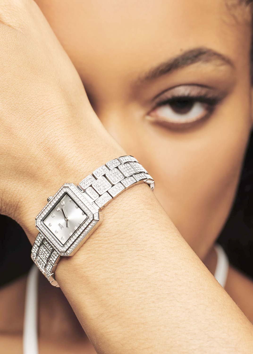 Arc. Женские наручные часы. Прямоугольный стальной корпус украшен паве из сверкающих кристаллов. Циферблат выполнен по технологии Sunray (солнечные лучи) и украшен фирменным логотипом. Метки в виде точек, украшенных искусственными бриллиантами. Мечевидные стрелки в стиле Sword.
