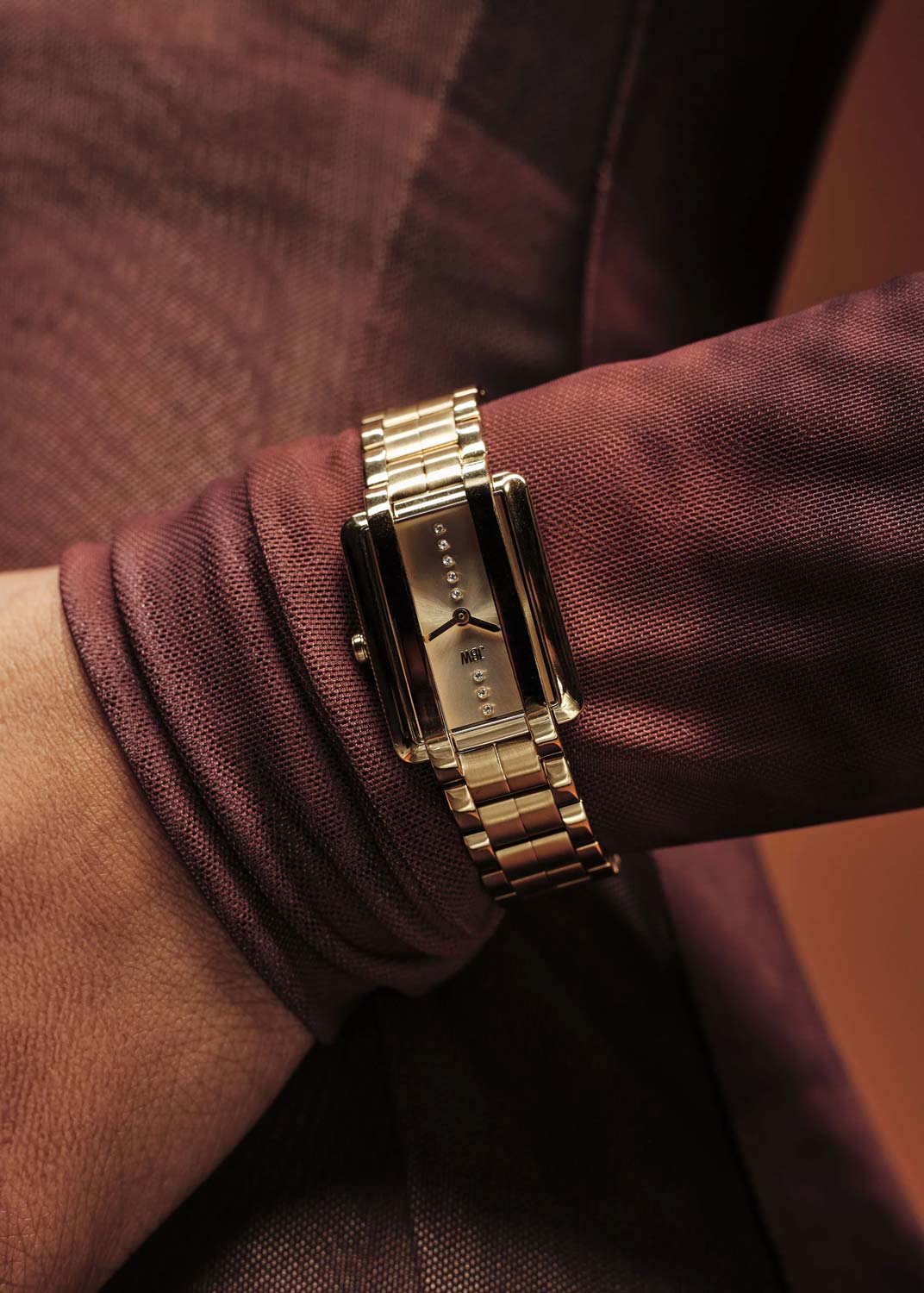 Mink Petite. Женские наручные часы. Прямоугольный стальной корпус. Циферблат выполнен по технологии Sunray (солнечные лучи) и украшен фирменным логотипом. Циферблат без меток украшен искусственными бриллиантами. Мечевидные стрелки в стиле Sword. Гладкая заводная головка. Стальная задняя крышка крепится на 4-х винтах. Стальной браслет с раскладывающейся застежкой.