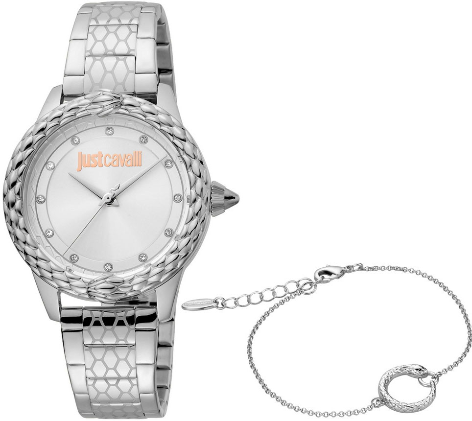 Выразительные часы, декорированные кристаллами, станут отличным подарком для прекрасных леди, которые выбирают не только функциональность, но и оригинальный стиль. Бесподобный комплект Animalier. Круглый стальной корпус. Безель украшен фигурками в виде двух змей. Метки в виде точек инкрустированы кристаллами. Рифленая заводная головка конусообразной формы. Стальной браслет с раскладывающейся застежкой. В наборе стальной браслет-цепочка на руку с фигуркой змеи.