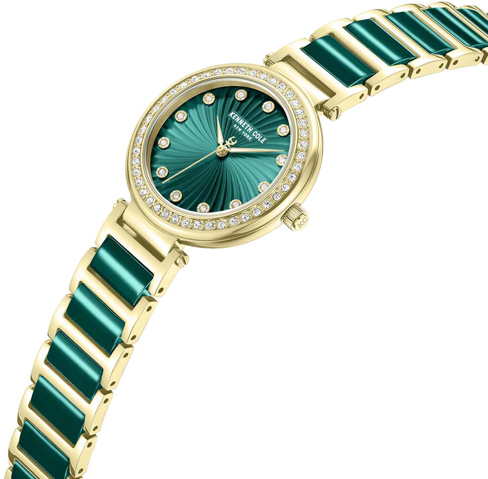 Женские наручные часы. Круглый стальной корпус. Безель инкрустирован кристаллами. Гильошированный циферблат выполнен по технологии Sunray (солнечные лучи). Метки в виде точек с кристаллами. Рифленая заводная головка. Браслет с керамическими вставками и раскладывающейся застежкой.