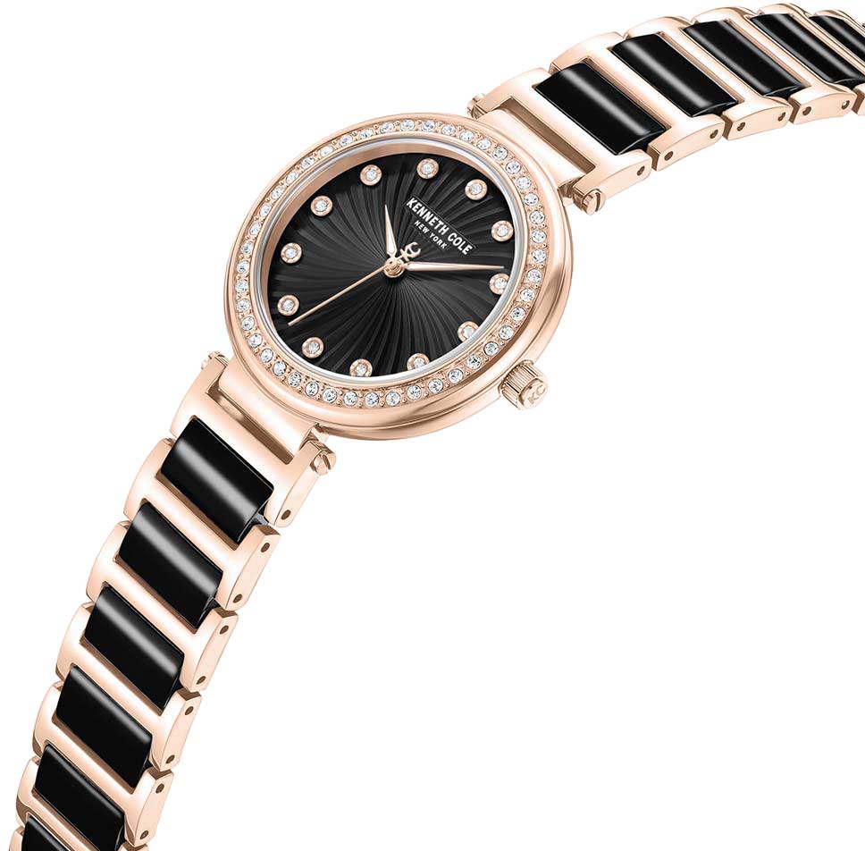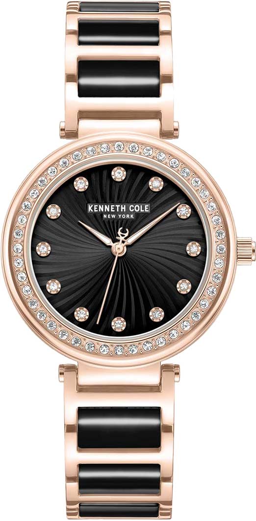 Женские наручные часы. Круглый стальной корпус. Безель инкрустирован кристаллами. Гильошированный циферблат выполнен по технологии Sunray (солнечные лучи). Метки в виде точек с кристаллами. Рифленая заводная головка. Браслет с керамическими вставками и раскладывающейся застежкой.
