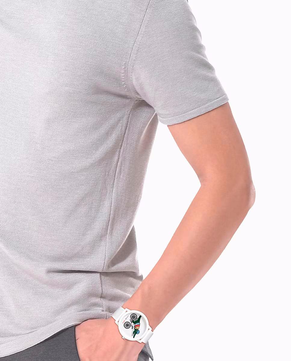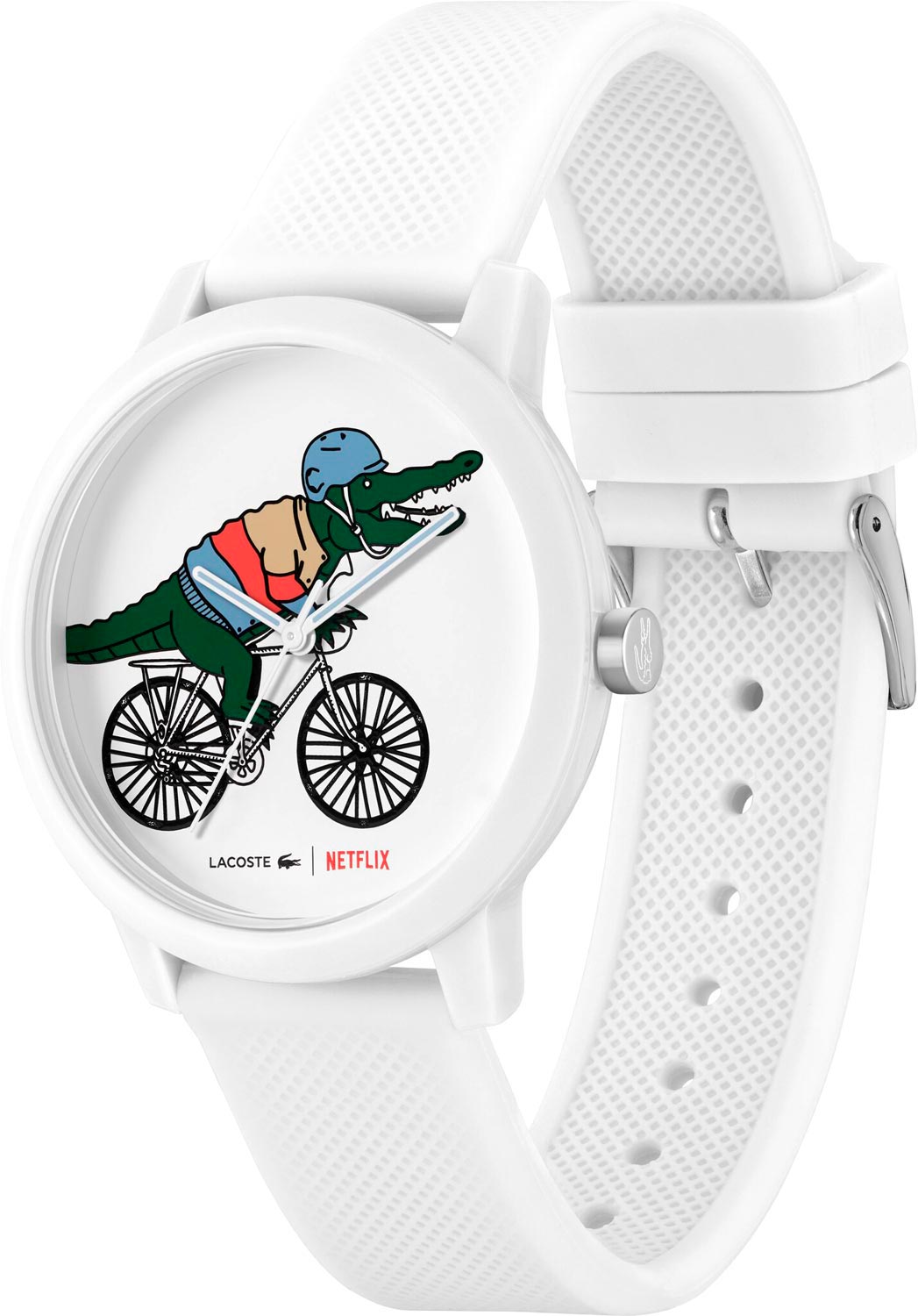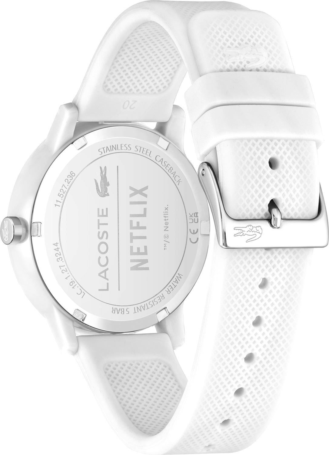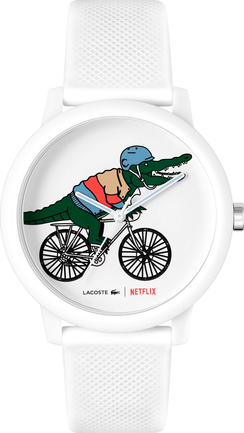 Практичная дизайнерская функциональность этих часов непременно придется вам по вкусу. Разумный выбор на каждый день. Модные дизайнерские мужские часы Lacoste.12.12 x Netflix Sex Education, выполненные в сотрудничестве с Netflix. Круглый пластиковый корпус с минеральным стеклом. Циферблат украшен стильным рисунком. Узкие прямоугольные стрелки в стиле Baton с люминесцентным покрытием, которое светится в темноте после непродолжительной зарядки на свету. Гладкая заводная головка. Завинчивающаяся задняя крышка. Текстурированный силиконовый ремешок с классической застежкой, украшенной фирменным логотипом.