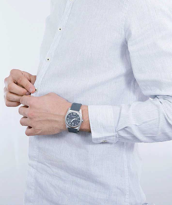 Практичные мужские часы с круглым корпусом будут актуальны в любой обстановке. Stealth. Мужские часы. Циферблат с метками в виде штрихов выполнен по технологии Sunray (солнечные лучи). Окошко даты находится в положении 6 часов. Титановая задняя крышка крепится на 4-х винтах. Силиконовый ремешок с классической застежкой.