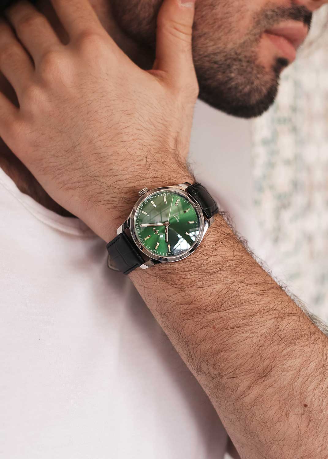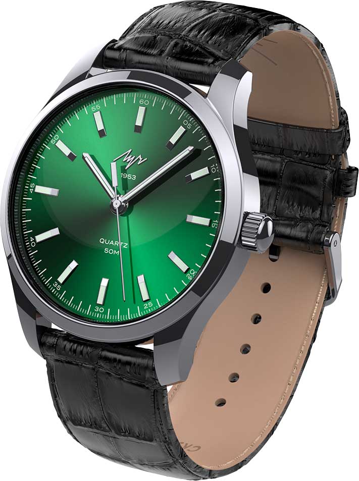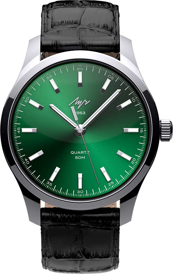 Мужские часы. Круглый стальной корпус. Циферблат выполнен по технологии Sunray (солнечные лучи) и защищен прочным сапфировым стеклом. Метки в виде штрихов. Ремешок с классической застежкой.