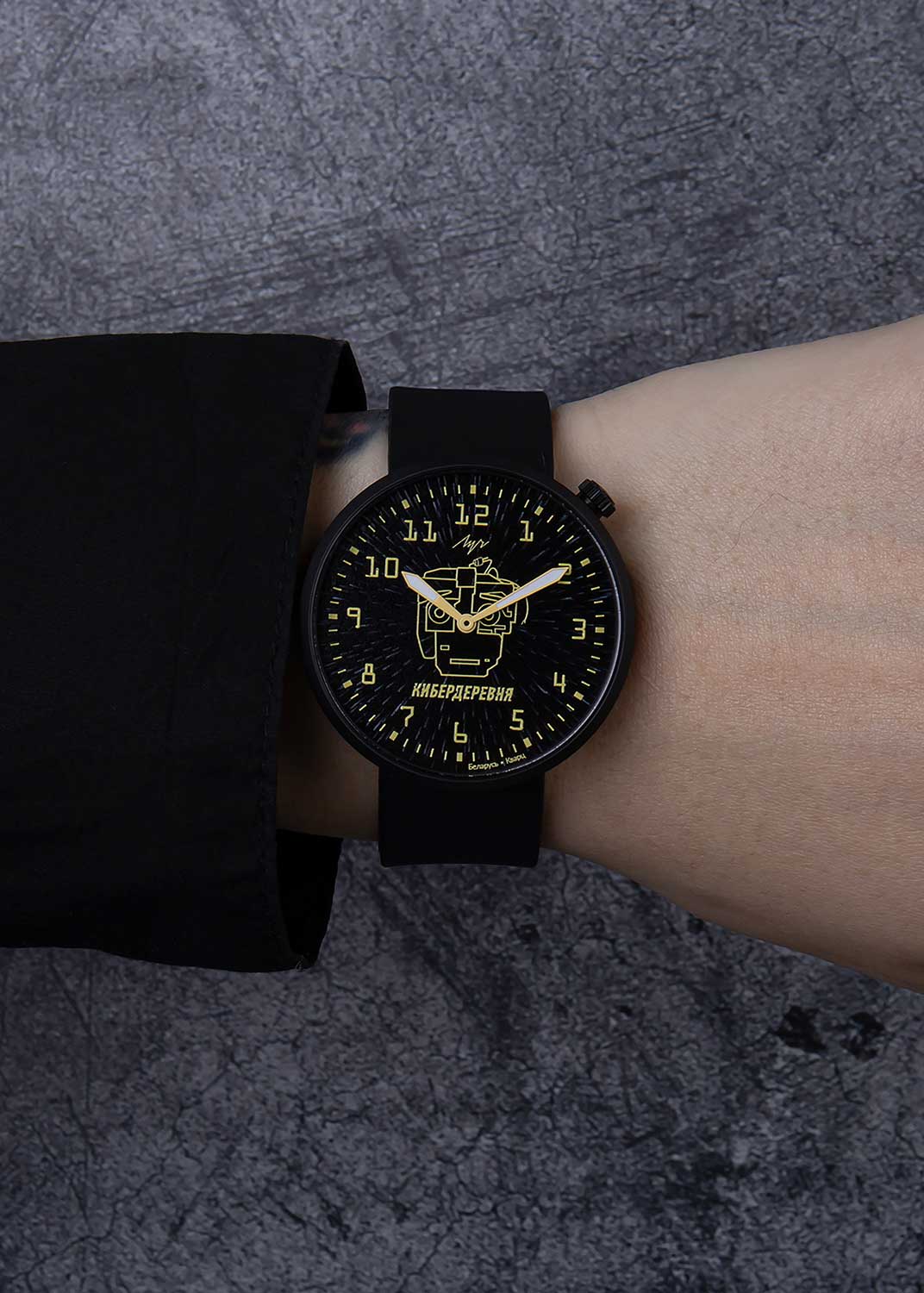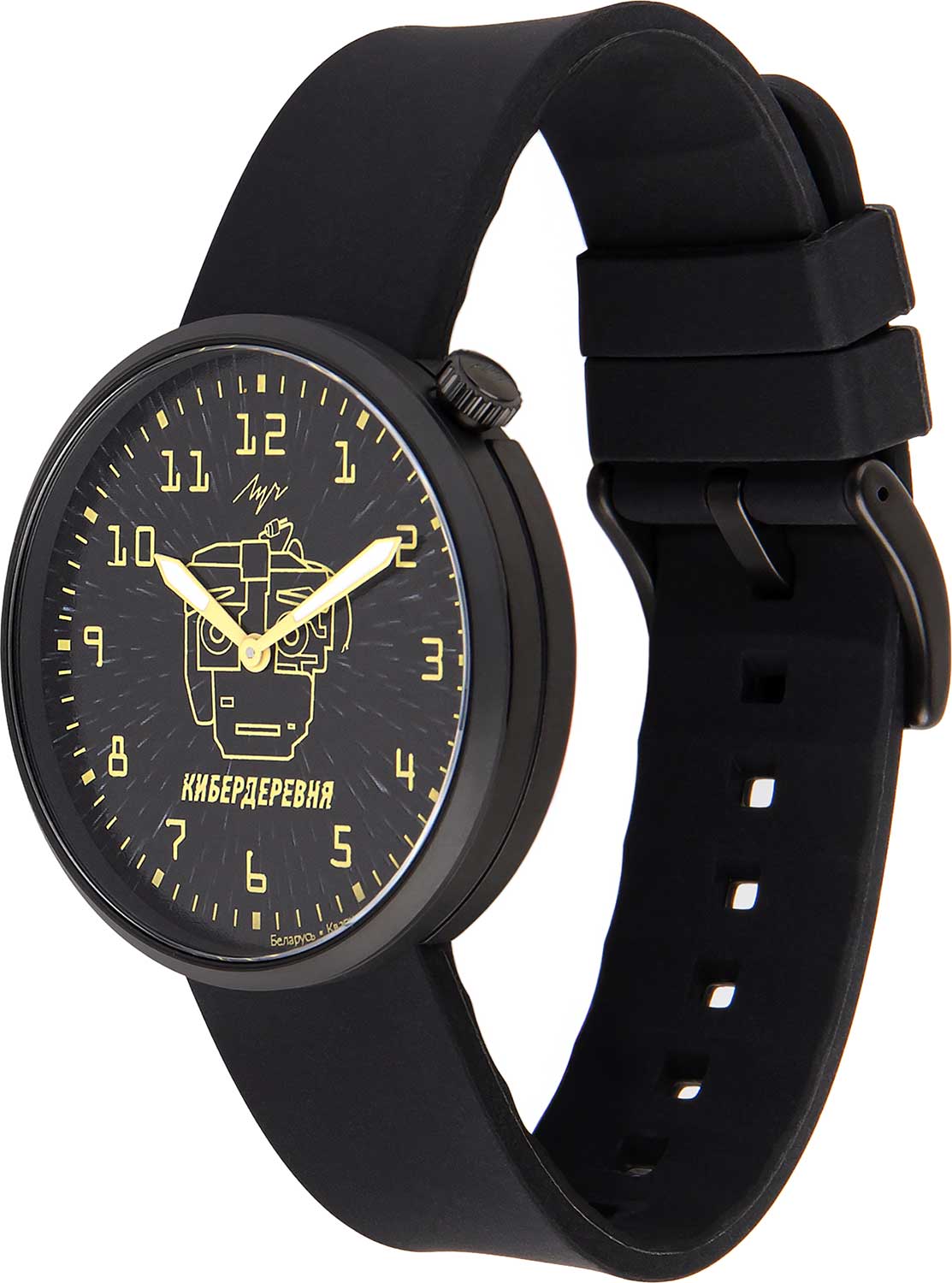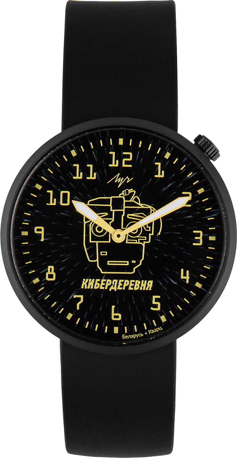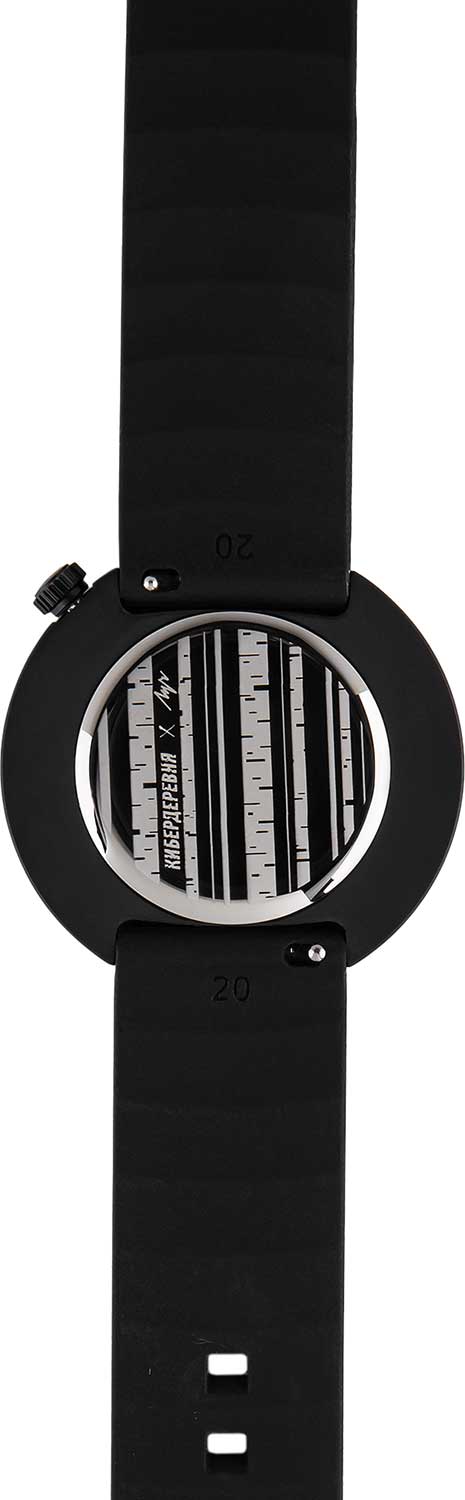 Кибердеревня. Унисекс часы. Лимитированная серия, посвященная российскому фантастическому сериалу «Кибердеревня» — 300 экземпляров. Циферблат с метками в виде арабских цифр защищен минеральным стеклом. Рифленая заводная головка находится в положении 1 час. Задняя крышка украшена гравировкой. Ремешок с классической застежкой и системой быстрой замены.