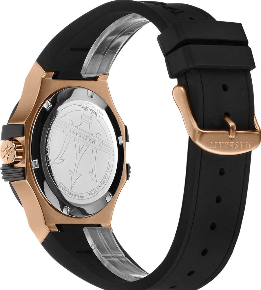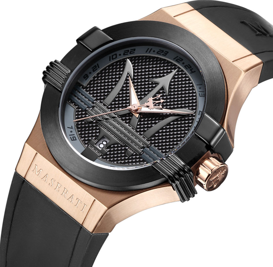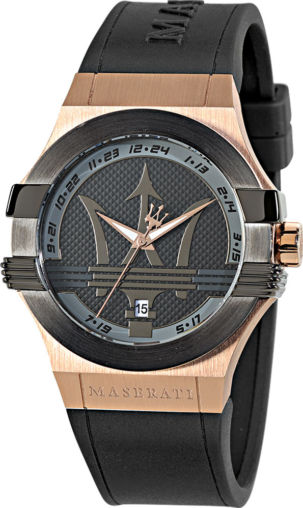 Potenza. Мужские часы со стальным корпусом. 12-ти и 24-х часовой формат времени. Циферблат с метками в виде арабских цифр украшен фирменным логотипом «Maserati». Окошко даты находится в положении 6 часов. Завинчивающаяся задняя крышка и заводная головка с защитой. Ремешок с классической застежкой.