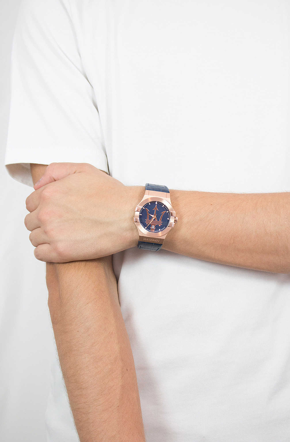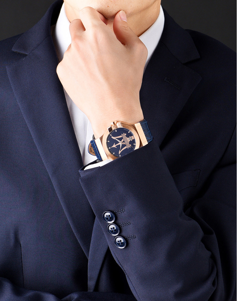 Potenza. Мужские часы со стальным корпусом. 12-ти и 24-х часовой формат времени. Циферблат с метками в виде штрихов украшен фирменным логотипом «Maserati». Окошко даты находится в положении 6 часов. Завинчивающаяся задняя крышка и заводная головка с защитой. Ремешок из натуральной кожи с тиснением под кожу аллигатора. Классическая застежка.