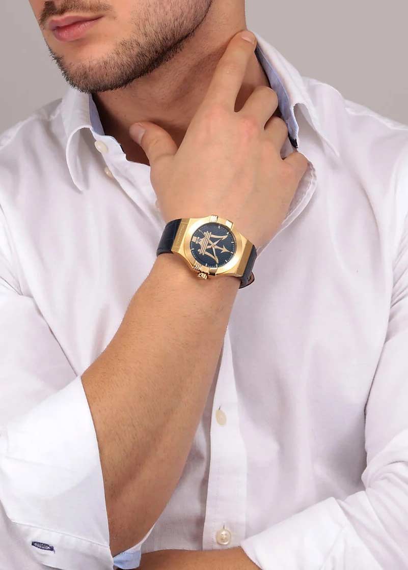 Мужские наручные часы со стальным корпусом. Циферблат с рисунком в клетку и метками в виде штрихов украшен фирменным логотипом ''Maserati''. Окошко даты находится в положении 6 часов.