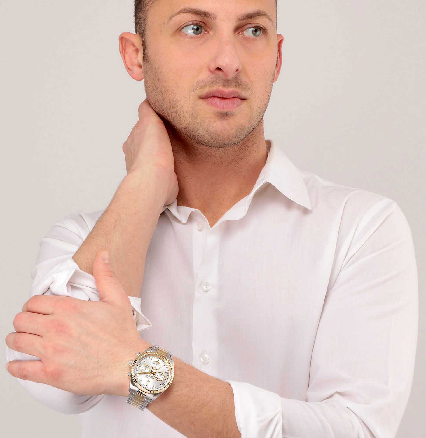 Competizione. Мужские кварцевые часы в круглом корпусе. 12-ти и 24-х часовой формат времени, дата и день недели вынесены на отдельные циферблаты. Циферблат выполнен по технологии Sunray (солнечные лучи) и украшен фирменным логотипом «Maserati». Метки в виде штрихов. Граненый безель. Завинчивающаяся задняя крышка и заводная головка. Браслет с раскладывающейся застежкой. Застежка с системой блокировки.