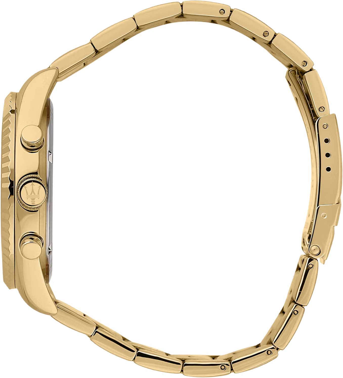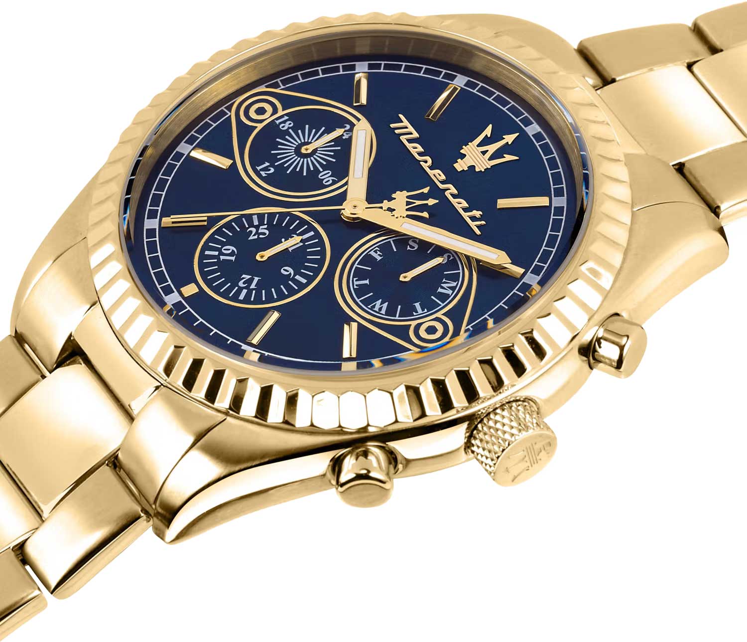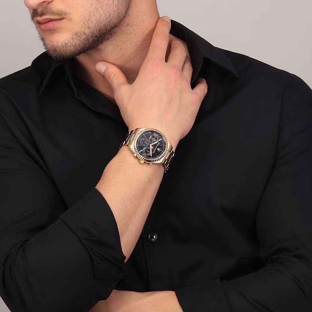 Мужские кварцевые часы в круглом корпусе. 12-ти и 24-х часовой формат времени, дата и день недели вынесены на отдельные циферблаты. Метки в виде штрихов. Граненый безель. Завинчивающаяся задняя крышка и заводная головка. Браслет с раскладывающейся застежкой. Застежка с системой блокировки.