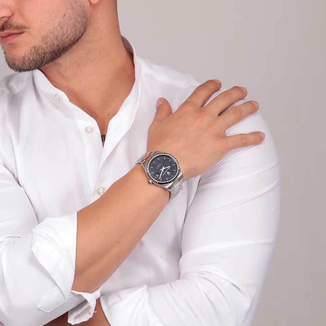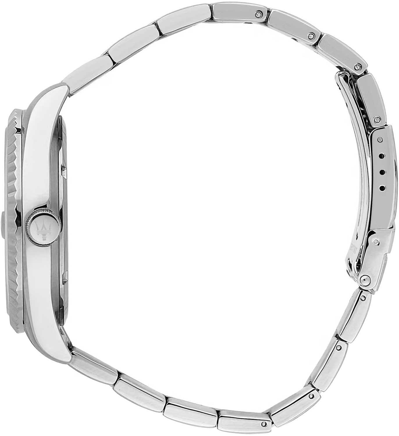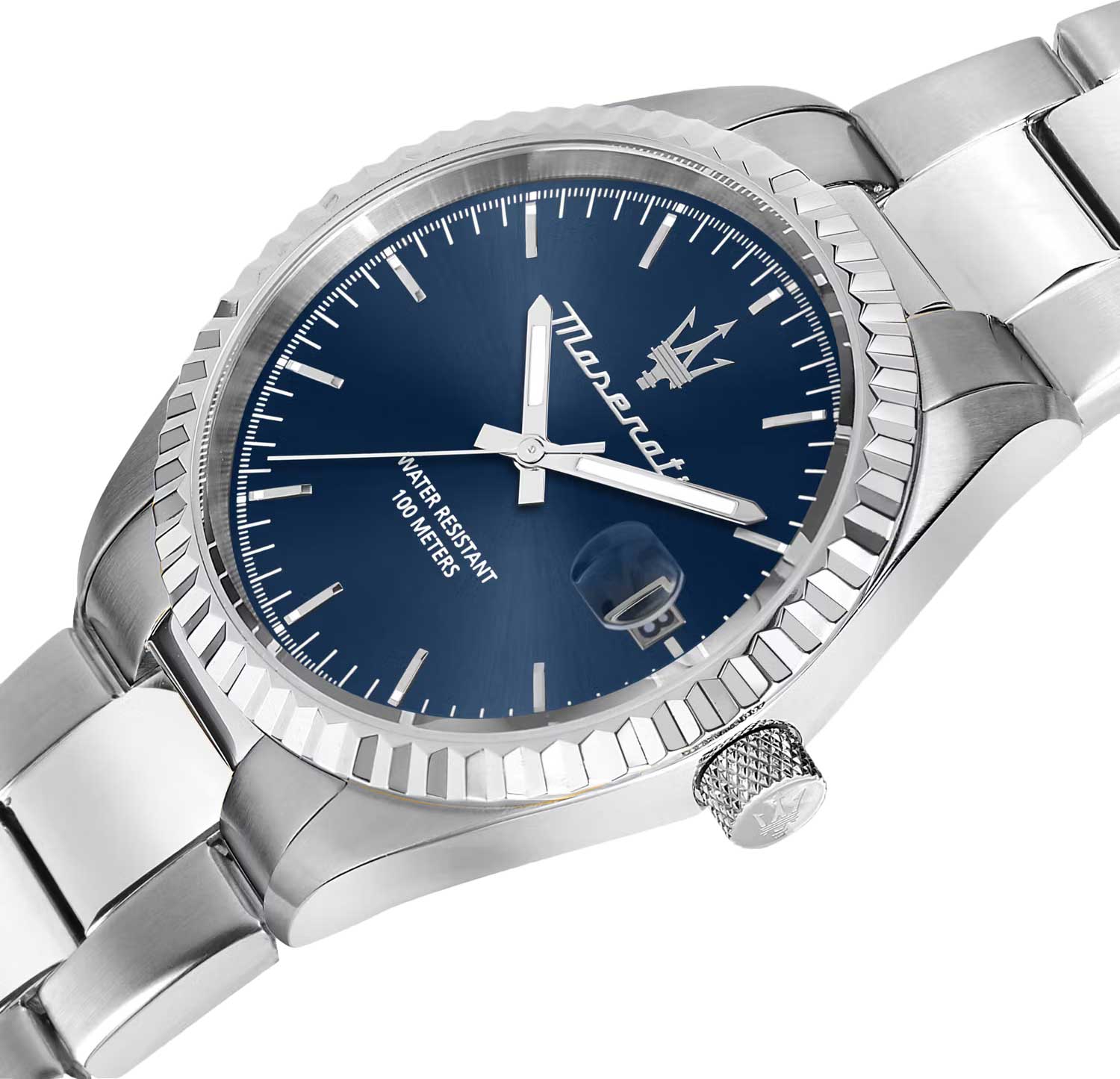 Мужские часы с круглым стальным корпусом. Циферблат выполнен по технологии Sunray (солнечные лучи) и украшен фирменным логотипом «Maserati». Метки в виде штрихов. Окошко даты с увеличительным стеклом находится в положении 3 часа. Граненый безель. Завинчивающаяся задняя крышка и заводная головка. Браслет с раскладывающейся застежкой. Застежка с системой блокировки.