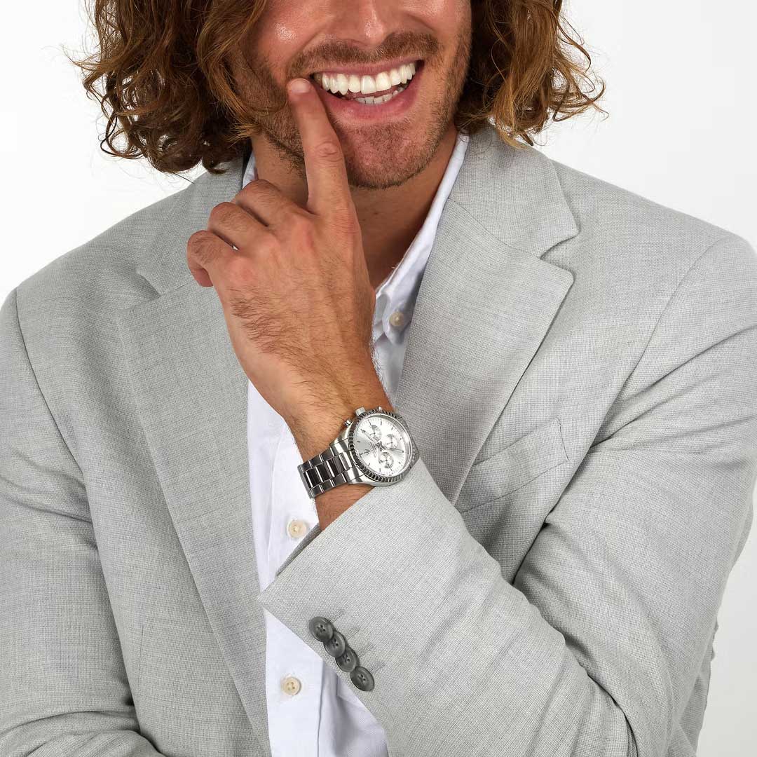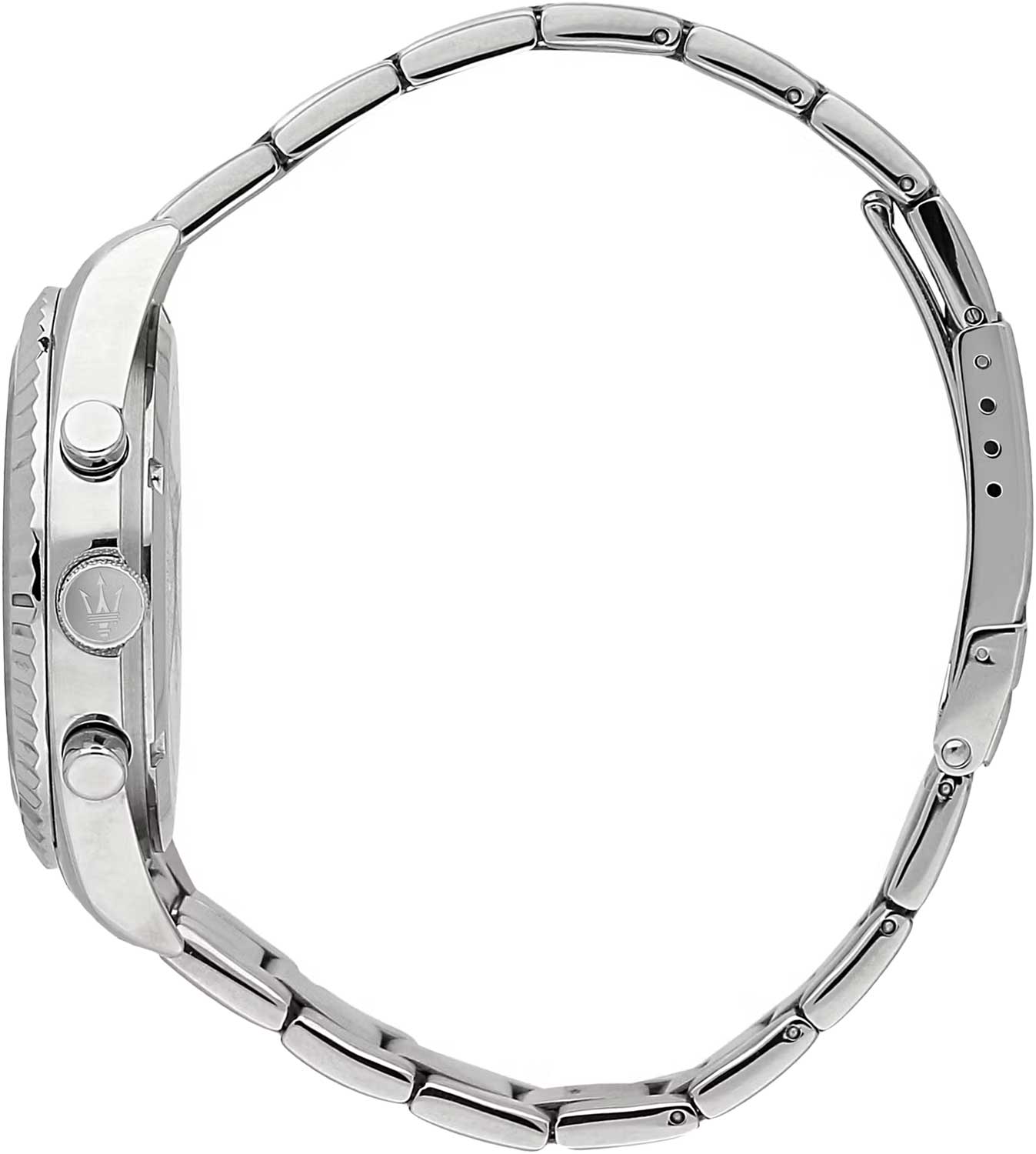 Мужские кварцевые часы в круглом корпусе. 12-ти и 24-х часовой формат времени, дата и день недели вынесены на отдельные циферблаты. Циферблат выполнен по технологии Sunray (солнечные лучи) и украшен фирменным логотипом «Maserati». Метки в виде штрихов. Граненый безель. Завинчивающаяся задняя крышка и заводная головка. Браслет с раскладывающейся застежкой. Застежка с системой блокировки.