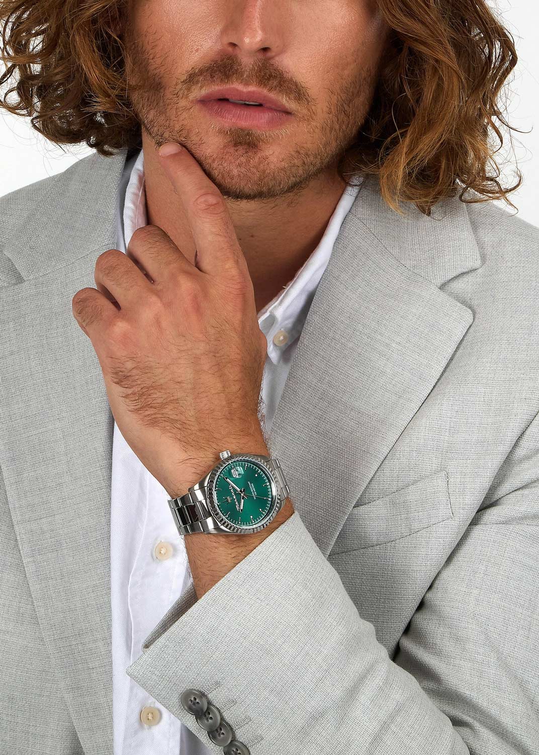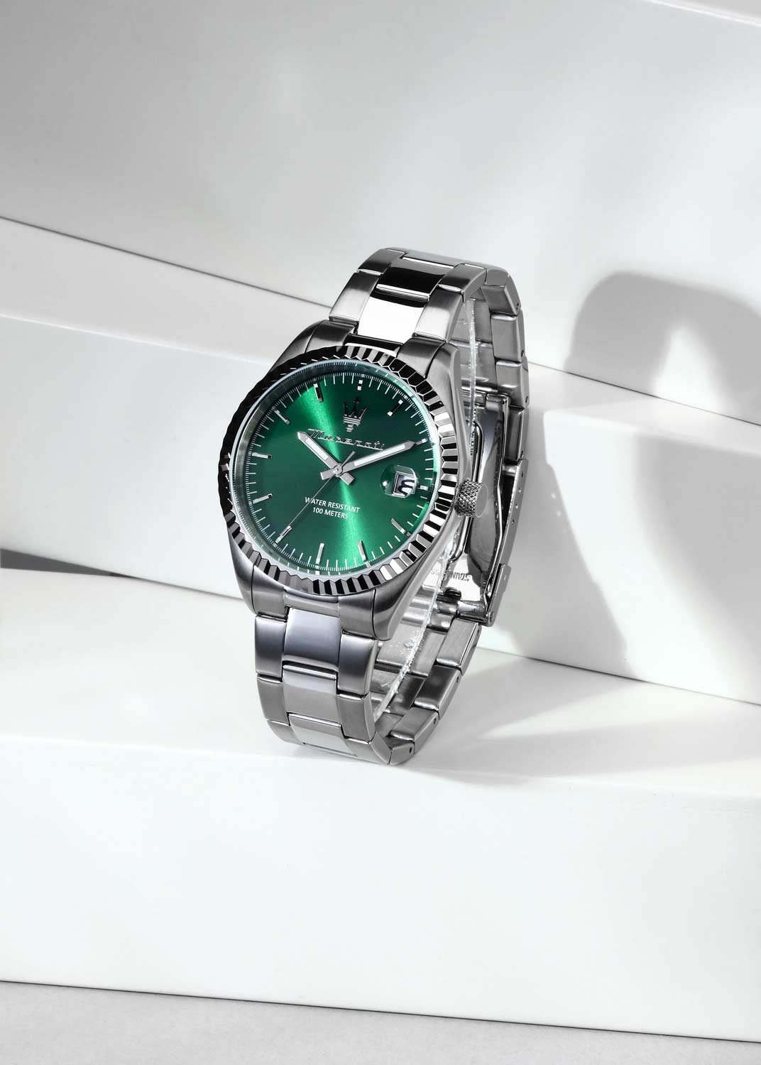 Окошко даты с увеличительным стеклом находится в положении 3 часа. Рифленая заводная головка. Завинчивающаяся задняя крышка. Браслет с раскладывающейся застежкой.