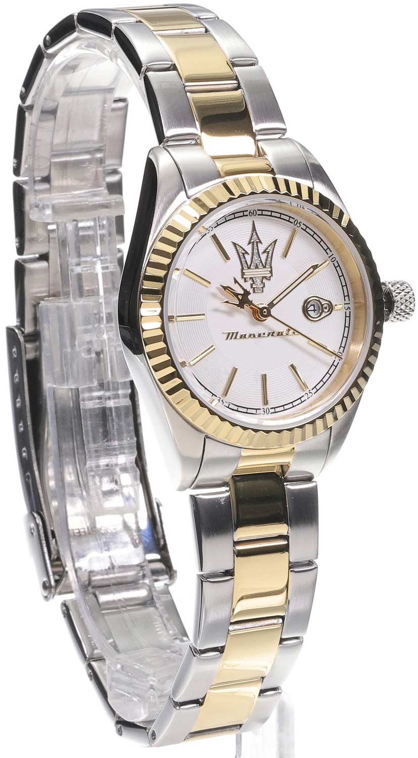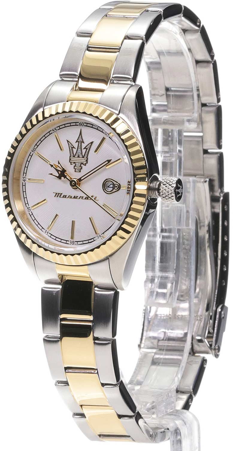 Женские наручные часы с круглым стальным корпусом. Граненый безель. Циферблат с метками в виде штрихов украшен фирменным логотипом ''Maserati''. Окошко даты находится в положении 3 часа.