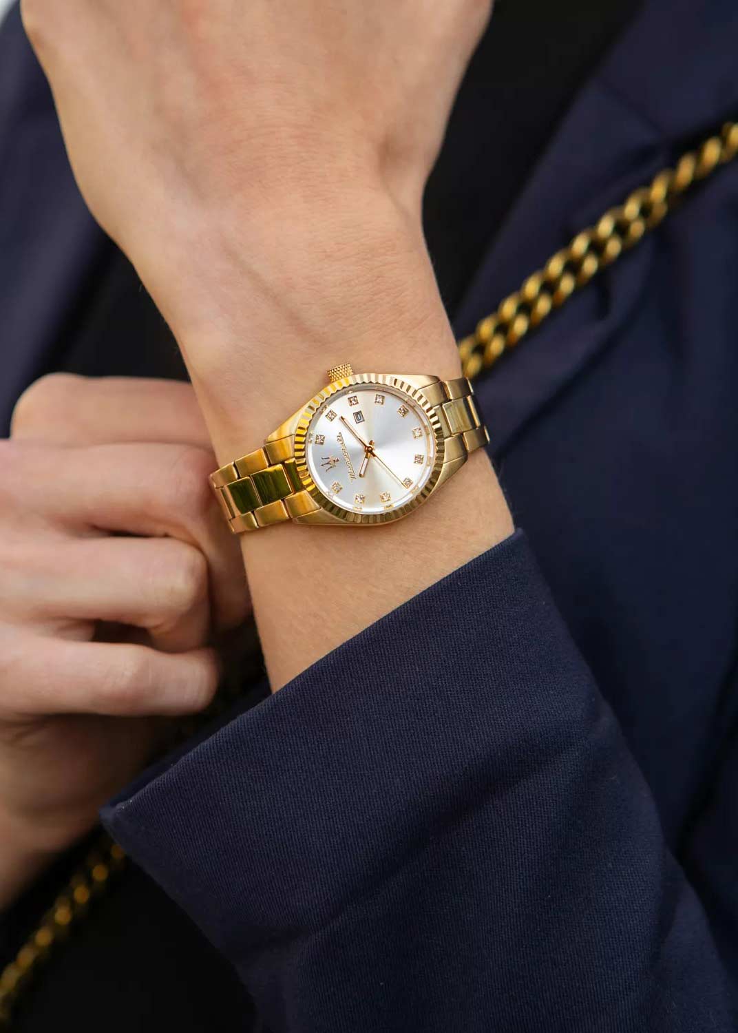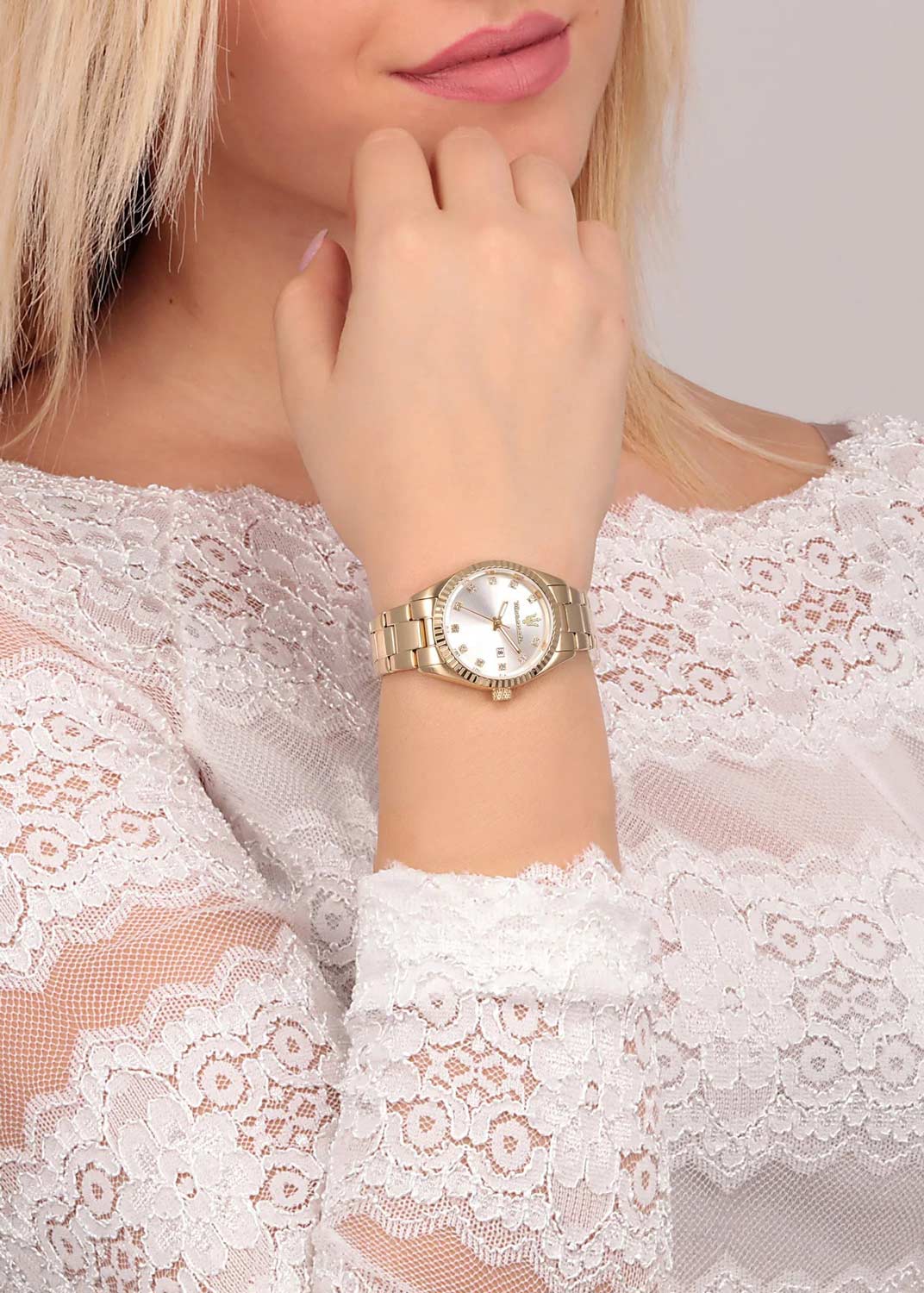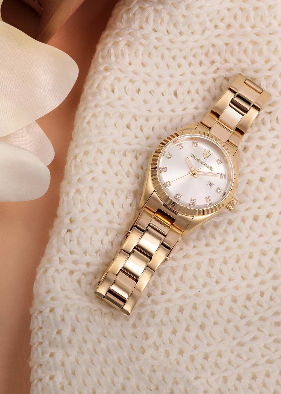 Женские наручные часы с круглым стальным корпусом. Граненый безель. Циферблат выполнен по технологии Sunray (солнечные лучи) и украшен фирменным логотипом ''Maserati''. Метки в виде точек с кристаллами.