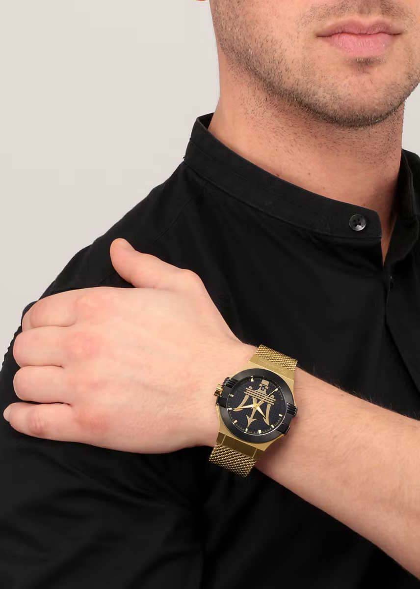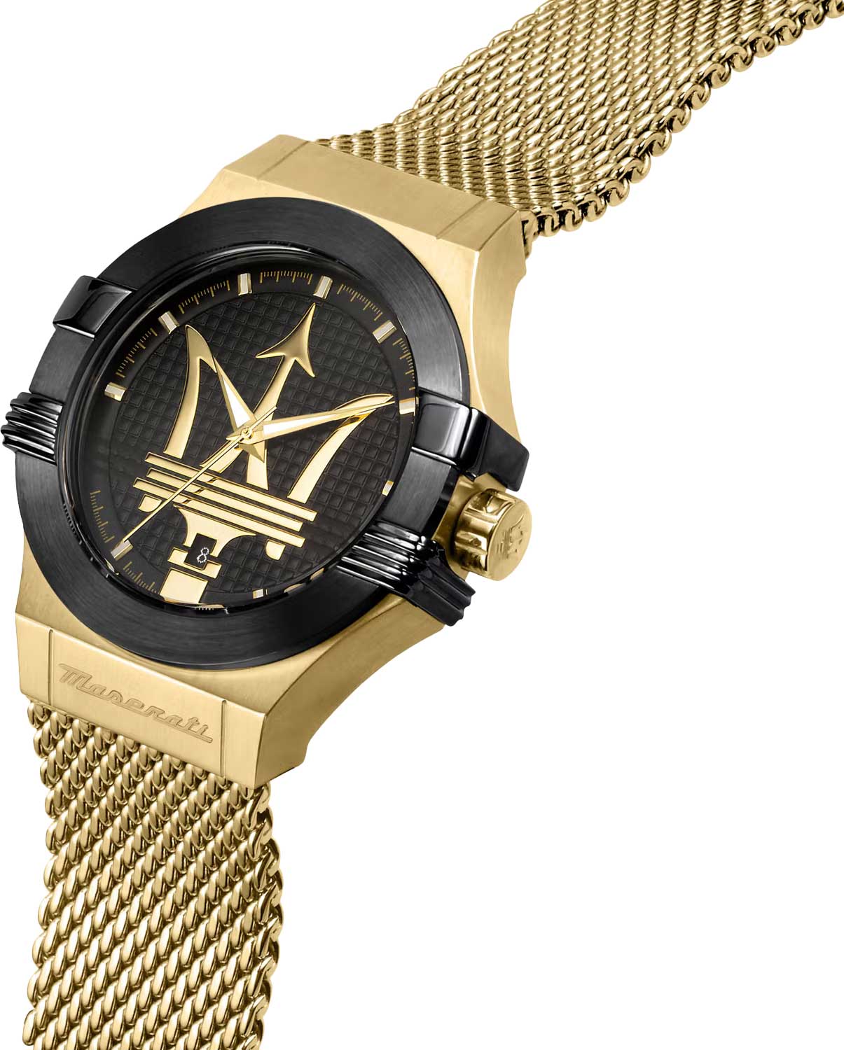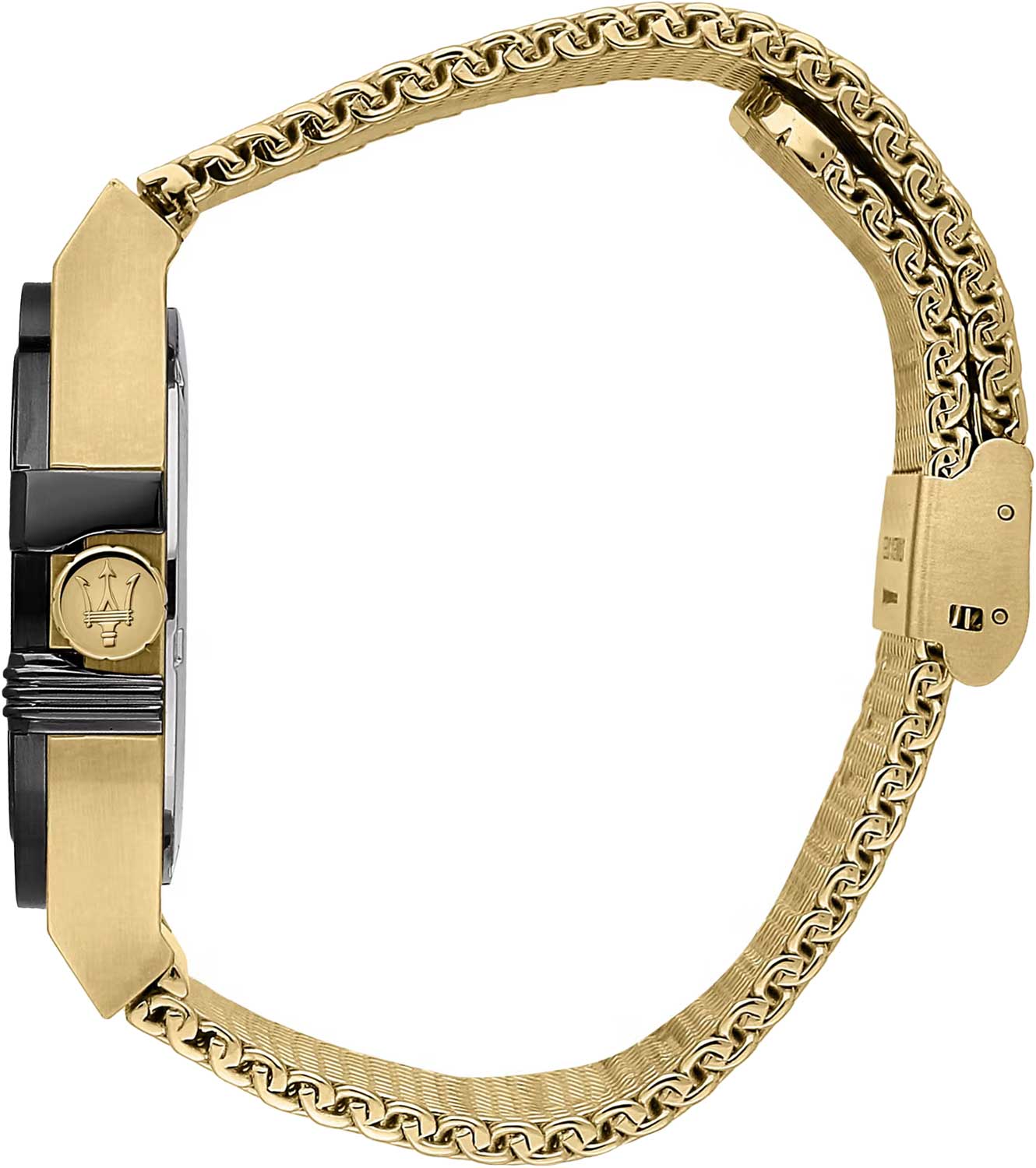 Мужские часы со стальным корпусом. Циферблат с метками в виде штрихов украшен фирменным логотипом «Maserati». Окошко даты находится в положении 6 часов. Завинчивающаяся задняя крышка и заводная головка с защитой. Браслет миланского плетения с регулируемой застежкой.