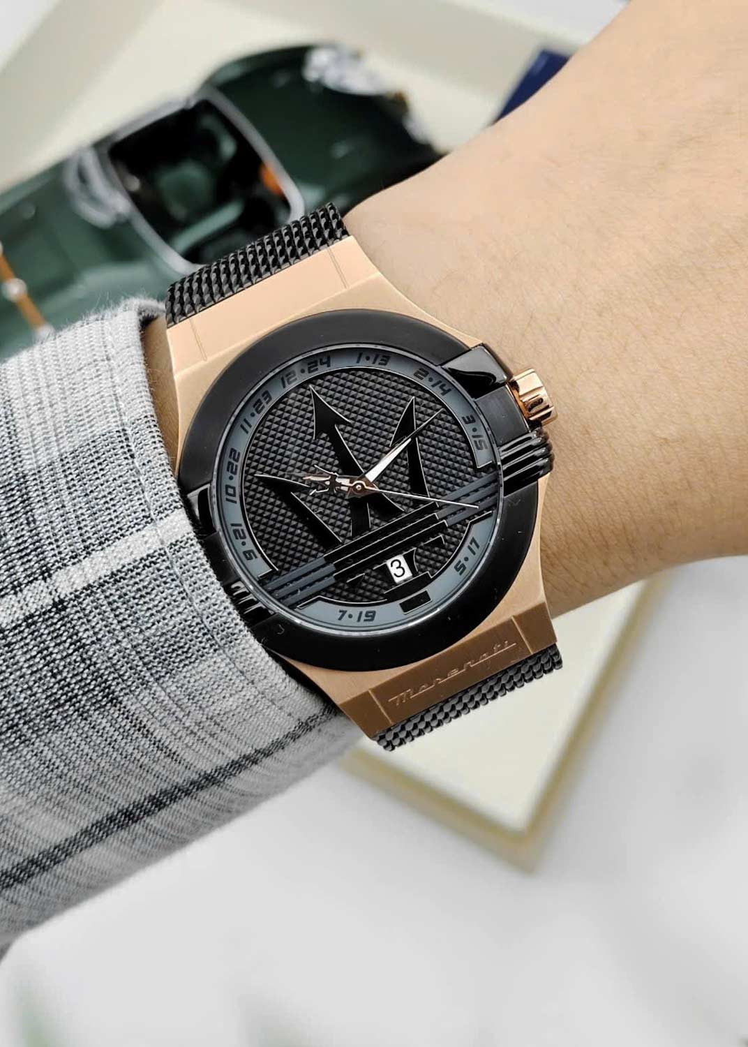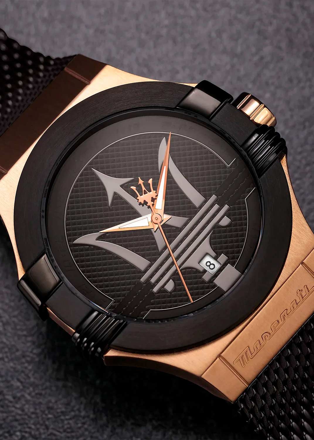 Мужские наручные часы со стальным корпусом. 12-ти и 24-х часовой формат времени. Гильошированный циферблат с метками в виде арабских цифр украшен фирменным логотипом ''Maserati''. Окошко даты находится в положении 6 часов.