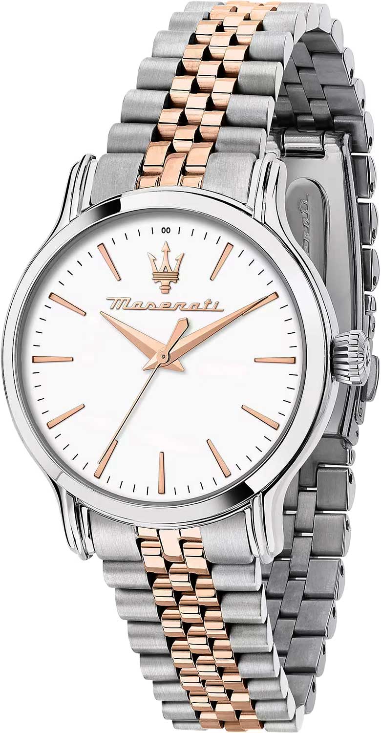 Женские часы с круглым стальным корпусом. Циферблат с метками в виде штрихов украшен фирменным логотипом «Maserati». Завинчивающаяся задняя крышка и заводная головка. Браслет с раскладывающейся застежкой.