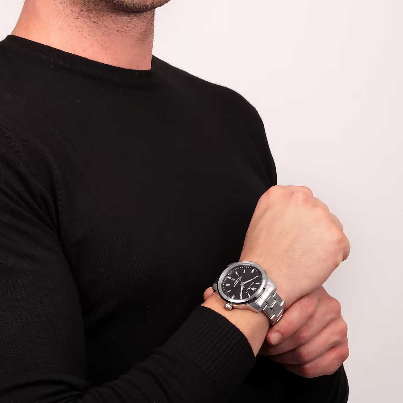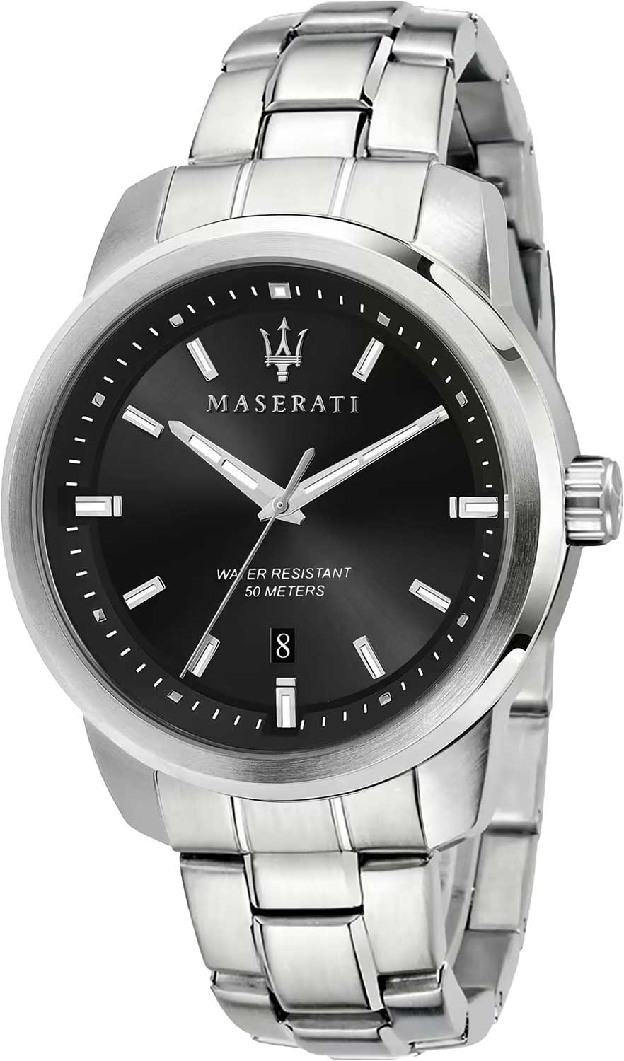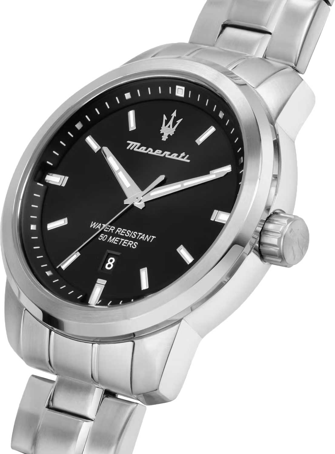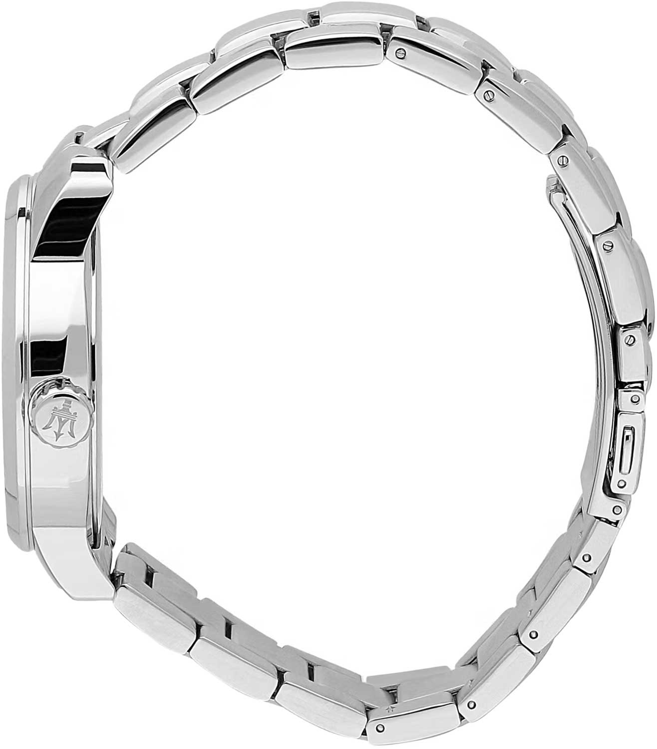 Мужские часы с круглым стальным корпусом. Циферблат выполнен по технологии Sunray (солнечные лучи) и украшен фирменным логотипом «Maserati». Метки в виде штрихов. Окошко даты находится в положении 6 часов. Браслет с раскладывающейся застежкой.